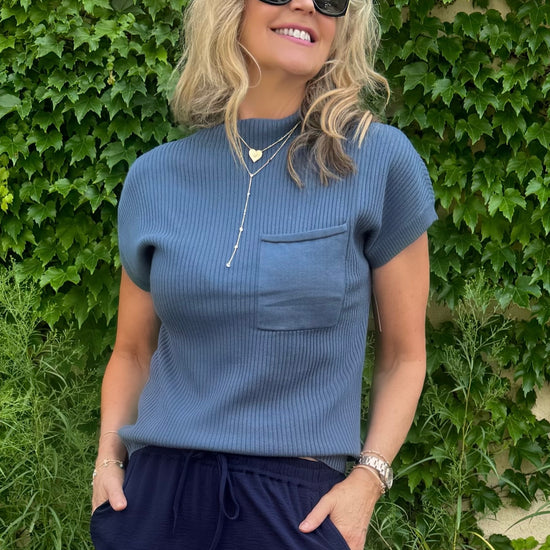 Gorgeous and classy ribbed cap sleeve top featuring a chic mock neck and a subtle chest pocket. Super lightweight and perfect as an underpinning or worn on its own — a versatile, elevated essential for any wardrobe.