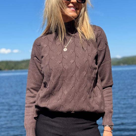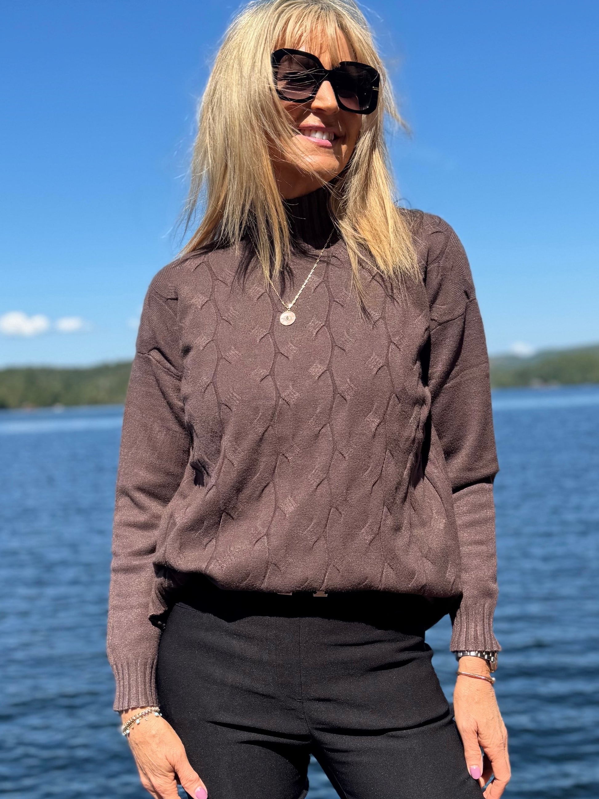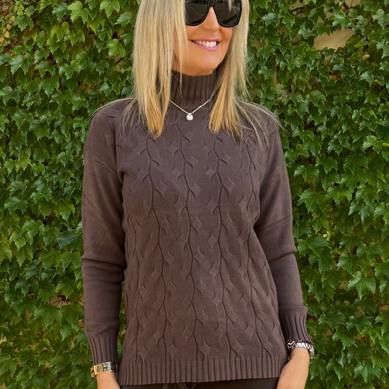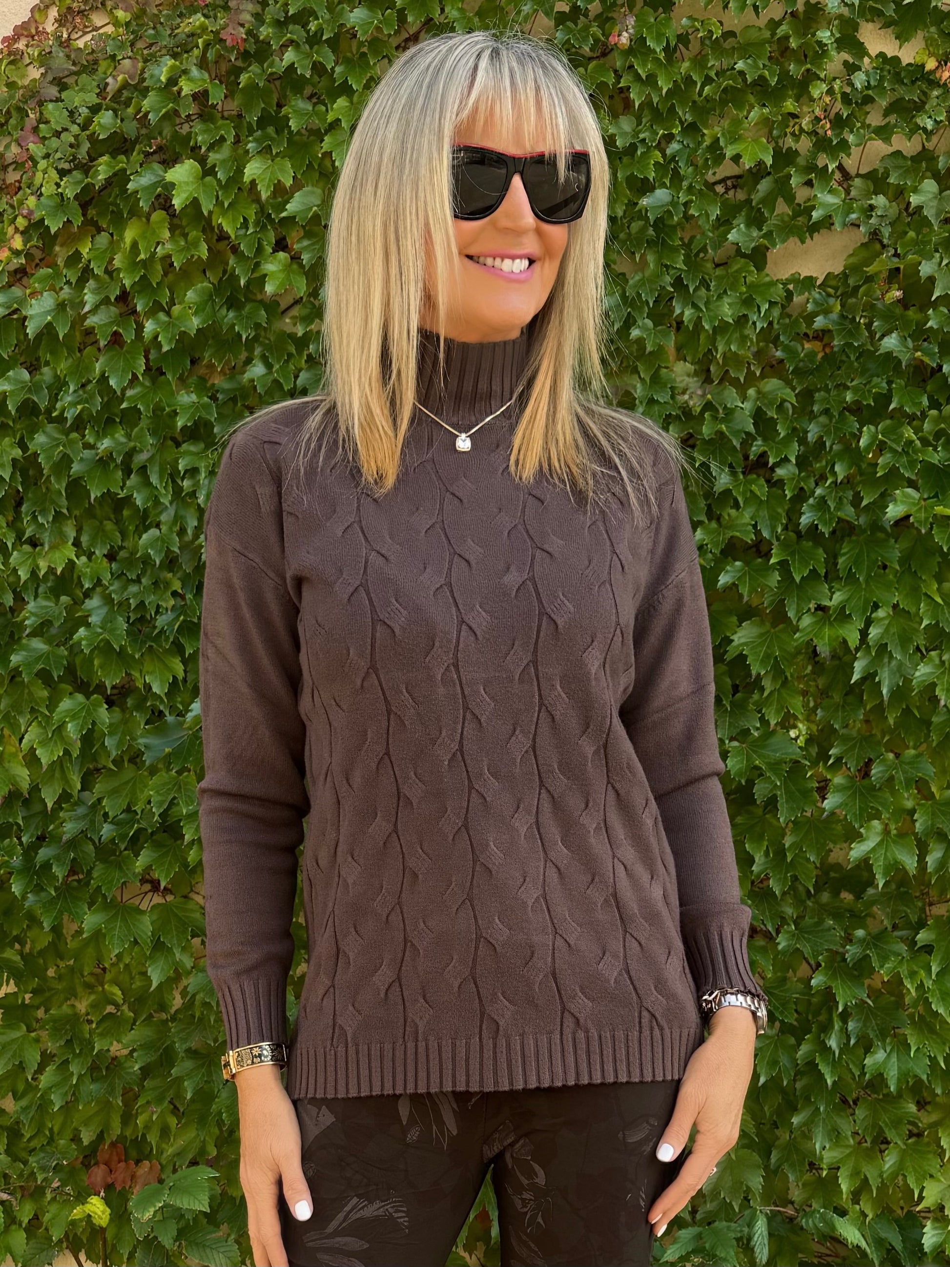 Gorgeous and ultra-soft cable knit sweater, designed with a side slit for a flattering touch. Features ribbed detailing along the mock neck, sleeves, and hem for a refined finish. Luxurious in feel and timeless in style, this piece is a cozy yet chic wardrobe essential.