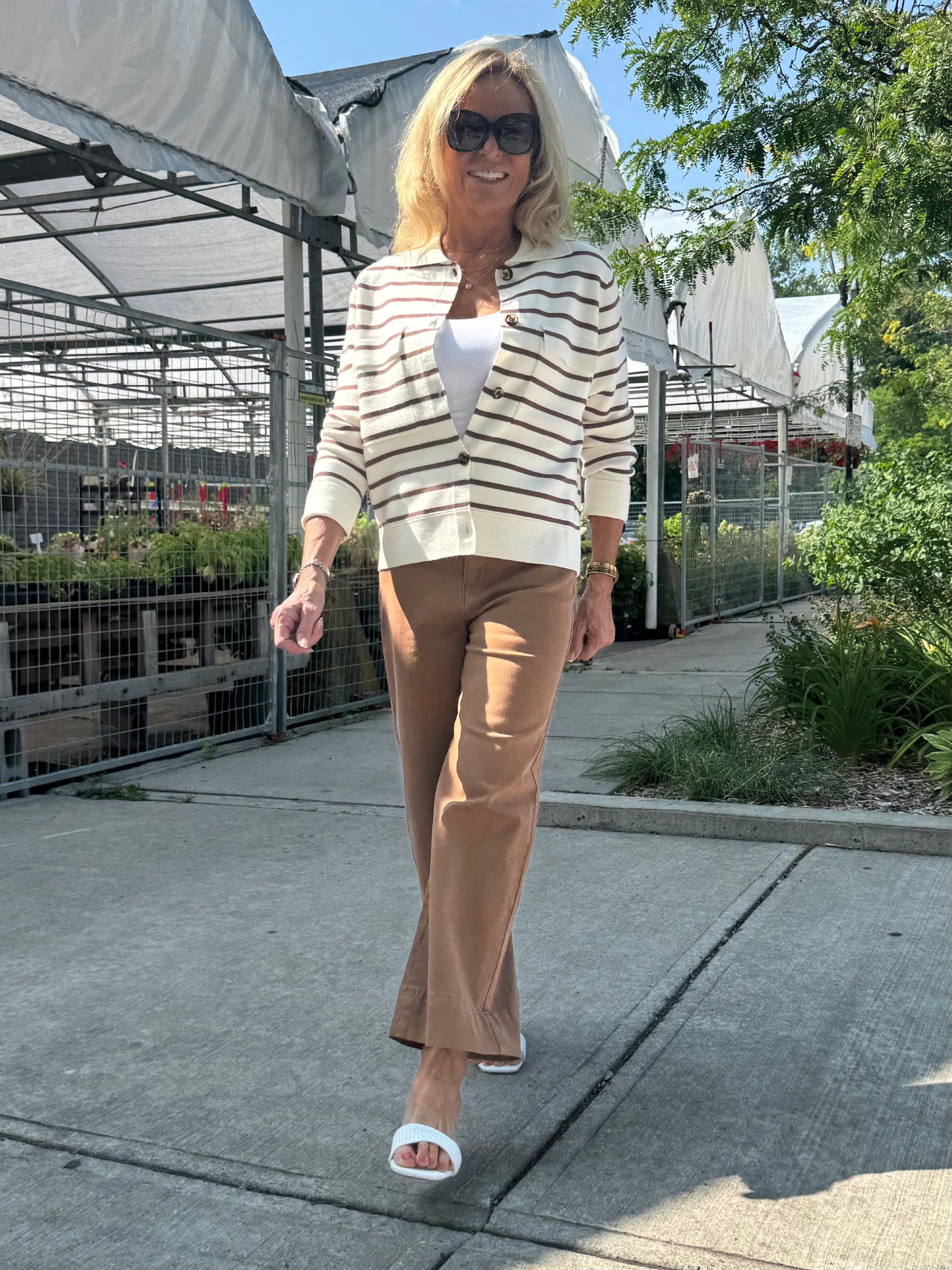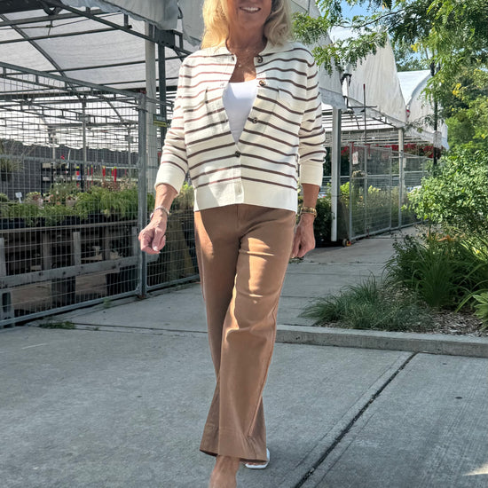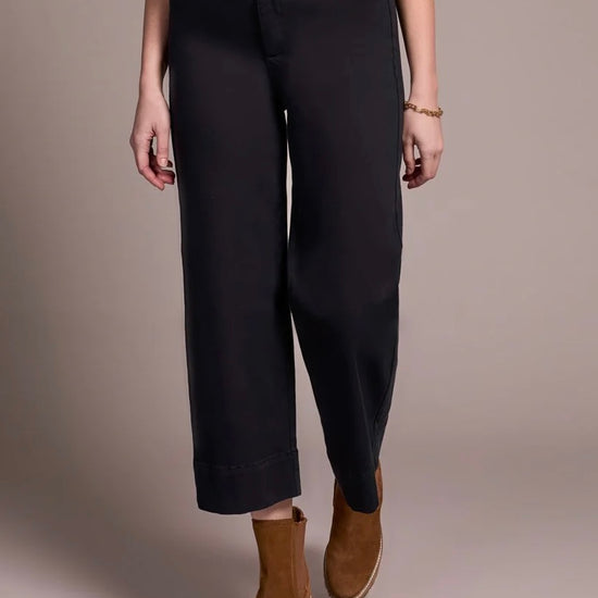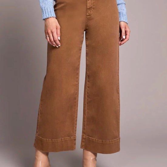 Turn heads in these effortlessly chic palazzo pants, featuring a flattering high-rise waist and a dramatic wide-leg silhouette. The double-button closure and classic fly lend a polished, tailored feel, while functional front and back pockets add everyday practicality. Made from soft stretch denim, they offer all-day comfort and effortless movement. Size 10-16 in the walnut colour is on backorder.