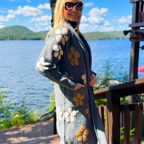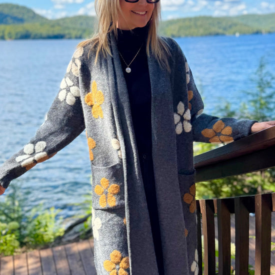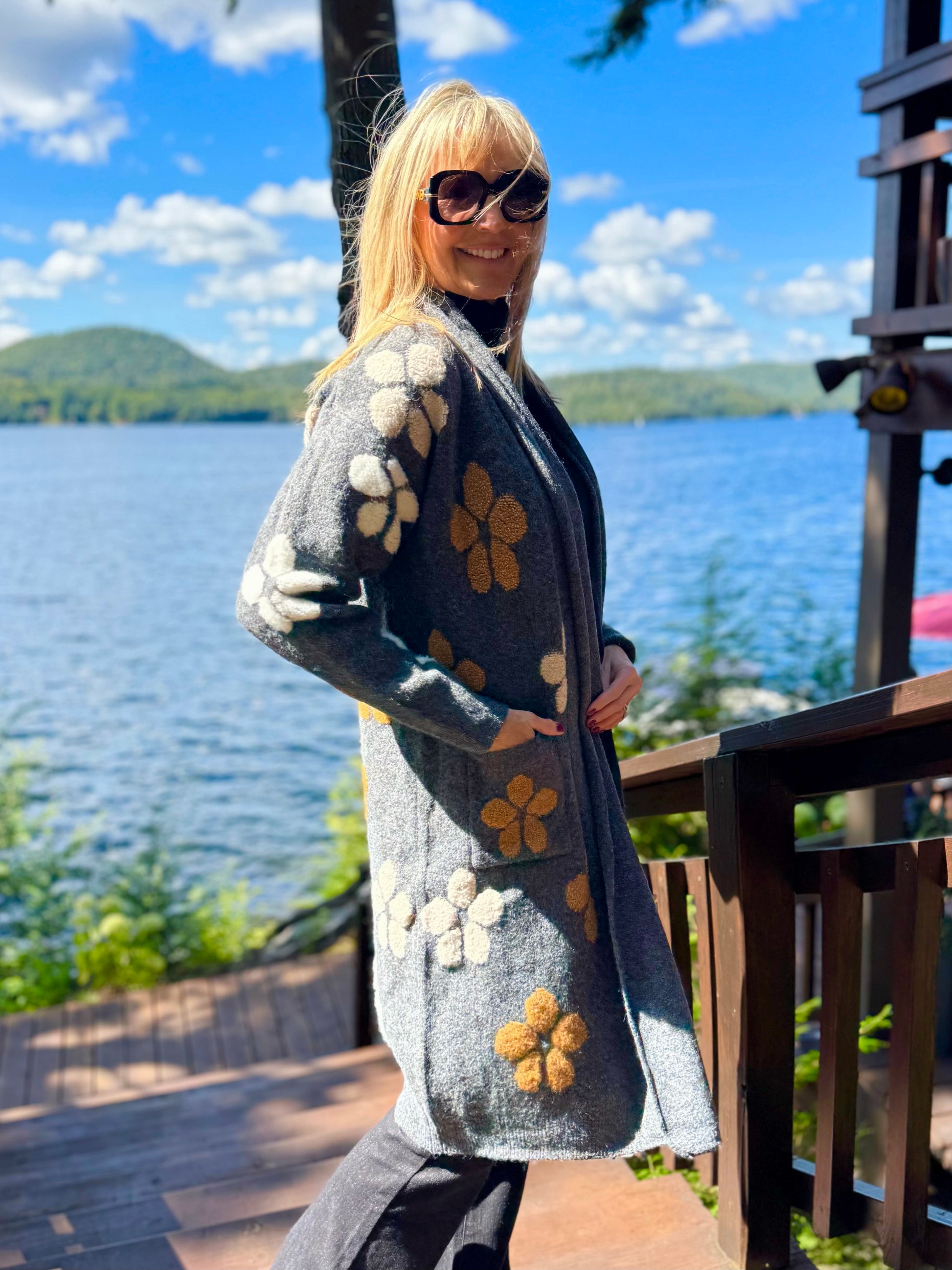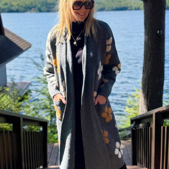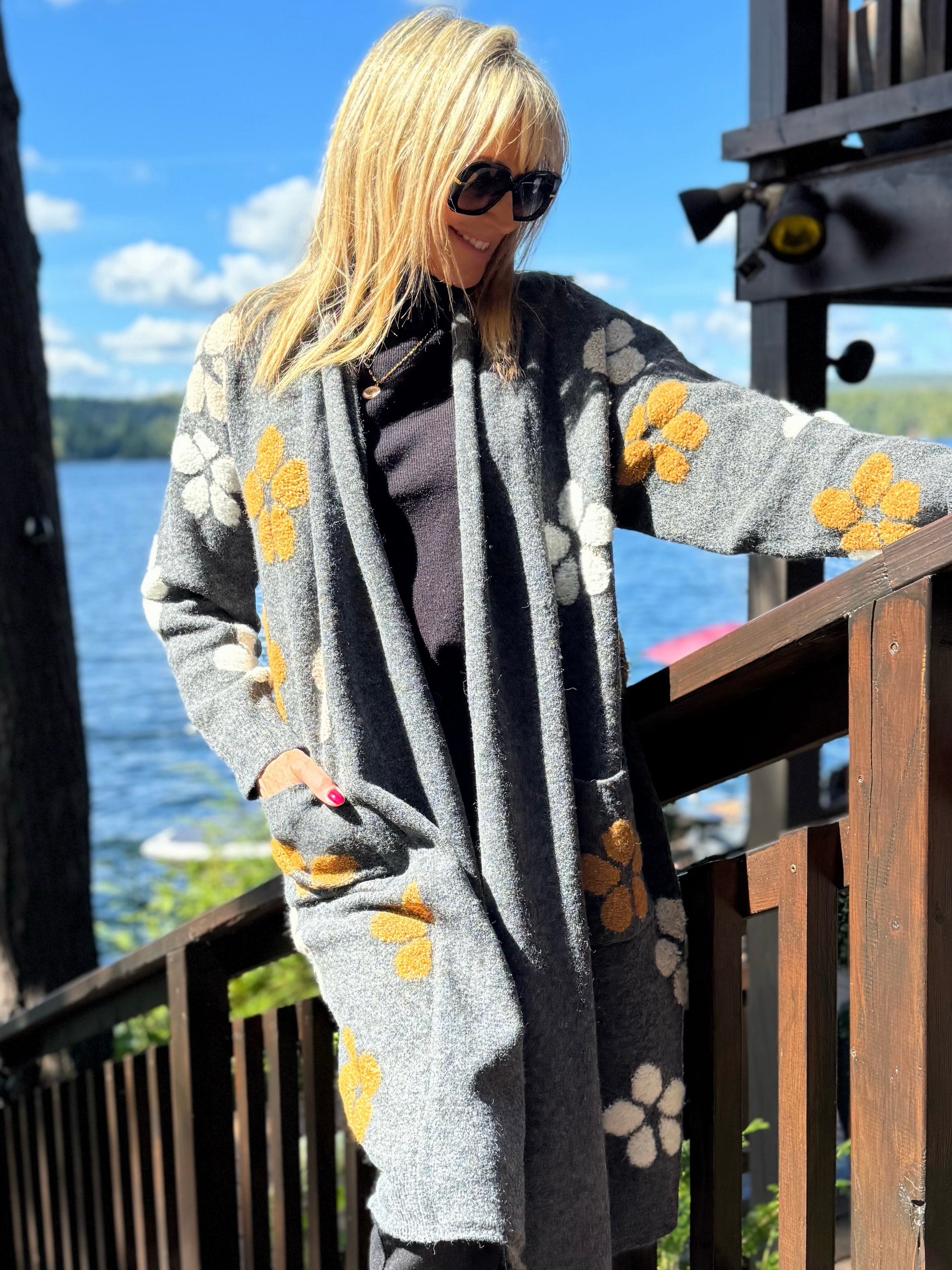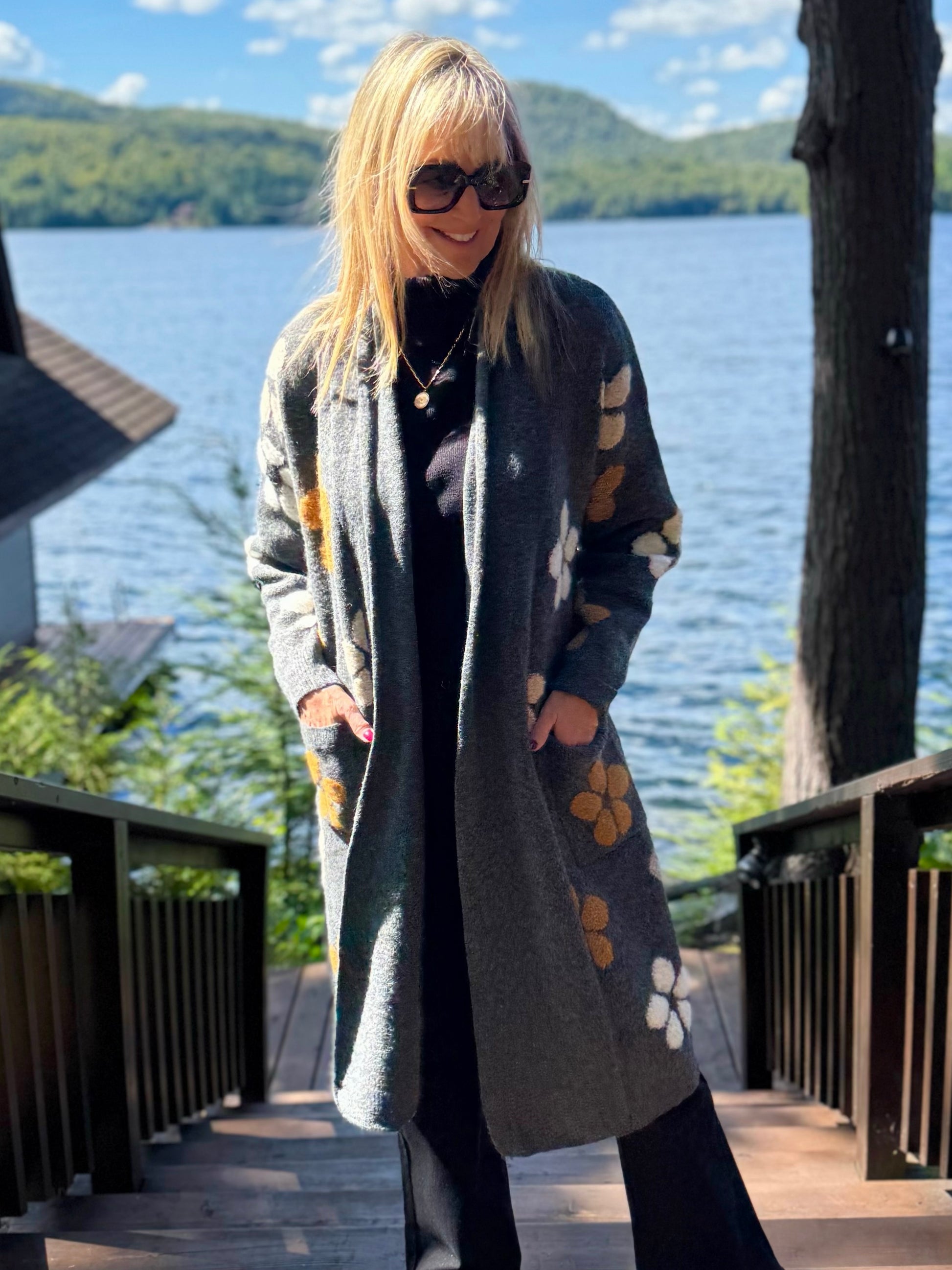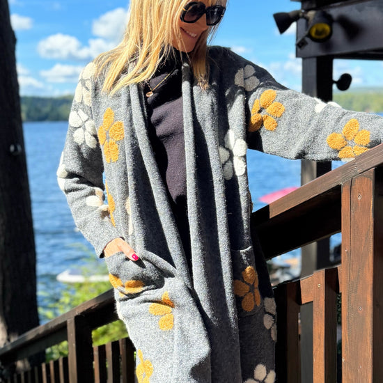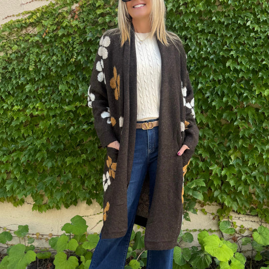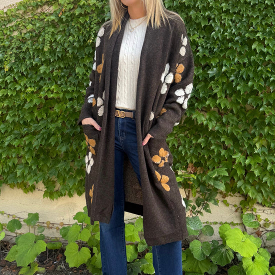 Wrap yourself in style with this fabulous floral cardigan, crafted from a super-luxurious, ultra-soft knit. Featuring a beautiful flower print and practical front square pockets, it’s the perfect blend of cozy comfort and chic design.