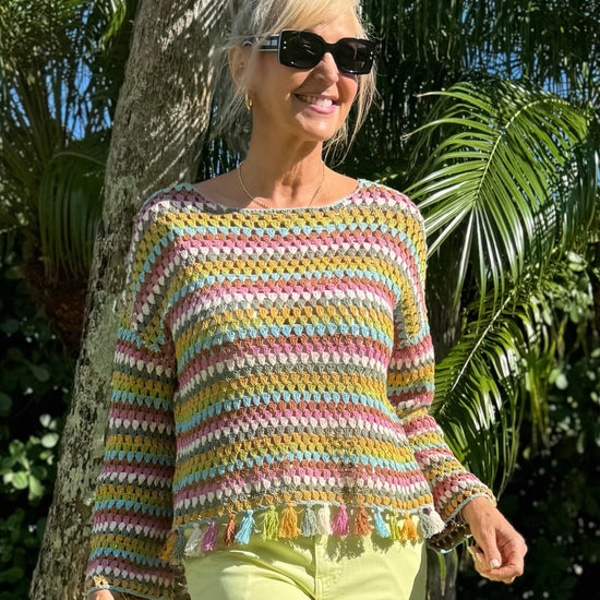 This gorgeous multicolour crochet top is full of effortless charm. Designed with soft bell sleeves and finished with delicate tassel trim, it brings beautiful texture and movement to your look. A standout piece that adds colour, detail, and easy elegance to any outfit.