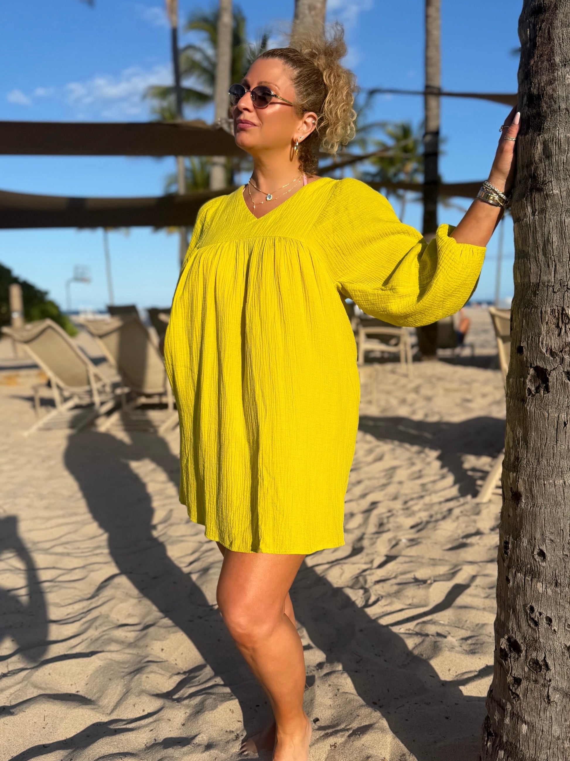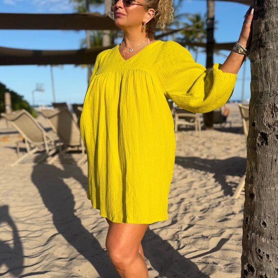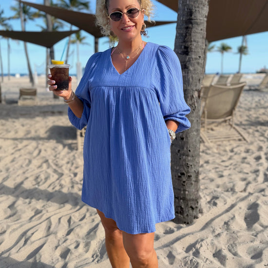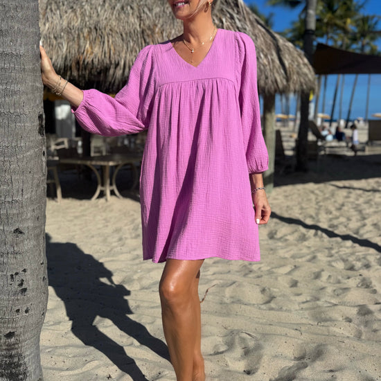 Stay cool and effortless in this 100% cotton dress, perfect for the beach or everyday wear. Designed with a slight V-neck, longer sleeves past the elbow with elasticized cuffs, and a relaxed, flowy fit that doesn’t cling, it’s breathable, comfortable, and effortlessly chic for any occasion. Preorder