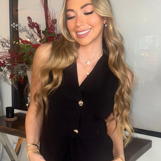 Super elegant and effortlessly chic, this piece features two gold button details and a subtly asymmetrical fit that adds a modern touch. The slight V-neckline flatters every shape and layers beautifully over a blouse. Perfect for everyday sophistication or dressing up for a special occasion.