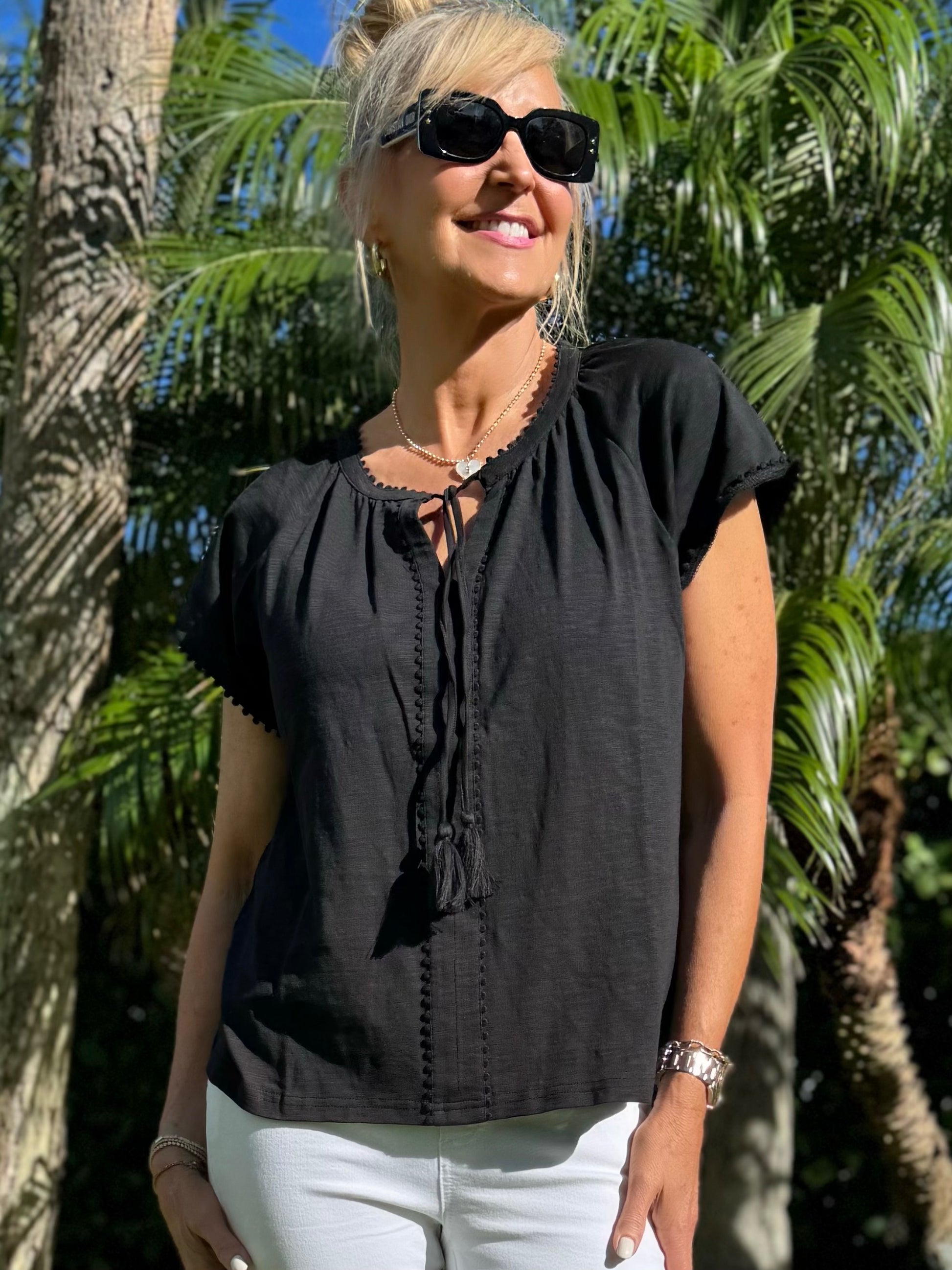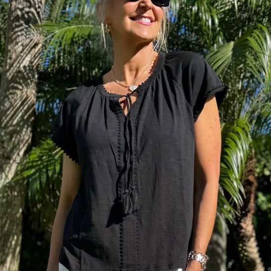 Effortless, timeless, and endlessly wearable. This lightweight black blouse features a relaxed, flowy silhouette that drapes beautifully on the body. Designed with delicate ladder trim detailing down the front and a soft tie neckline finished with tassels, it adds just the right touch of bohemian charm. The short flutter sleeves and breathable fabric make it perfect for warm days, while the classic black hue keeps it versatile year-round.