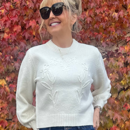 Cozy meets chic with this soft off-white sweater featuring beautiful tonal floral embroidery. Designed with a classic round neckline, ribbed cuffs and hem, and subtle balloon sleeves for a feminine touch. The delicate 3D floral details on the front and sleeves add texture and charm, making it the perfect piece to dress up or down. Pair it effortlessly with your favorite jeans for a stylish everyday look.