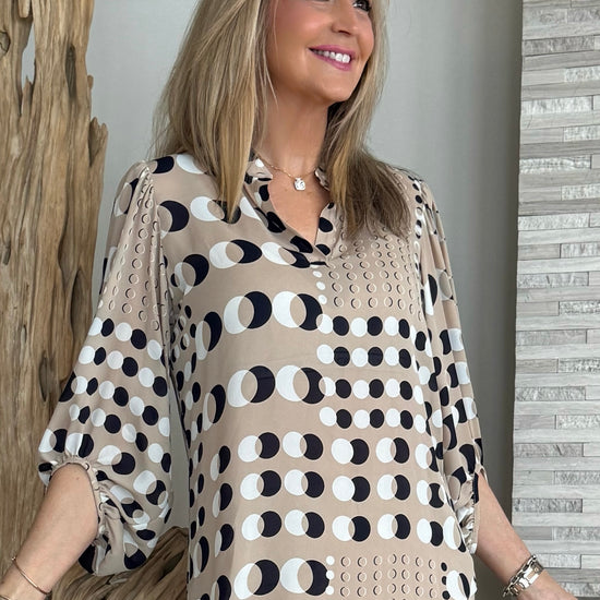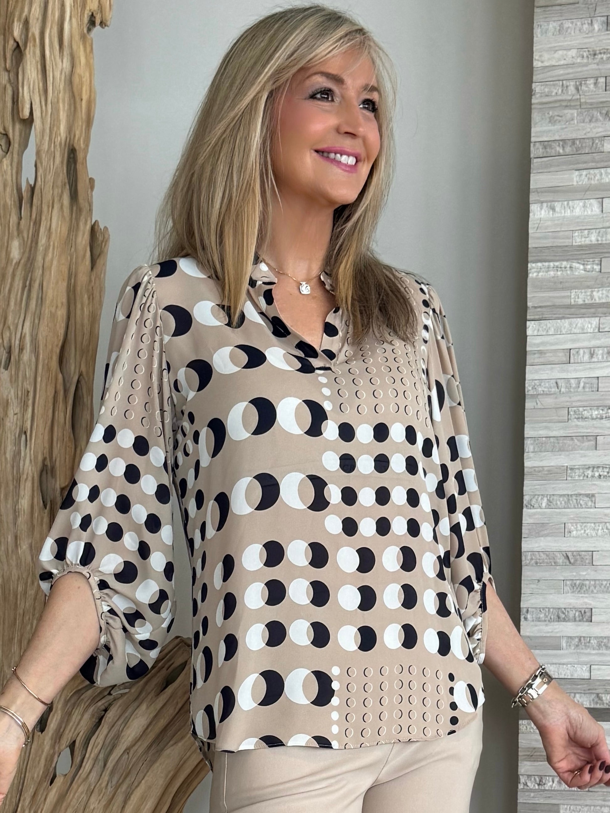 Light and breezy with a playful twist, this recycled georgette tunic features a dotted print, a refined stand collar with a front slit, and three-quarter puff sleeves for an effortless silhouette.
