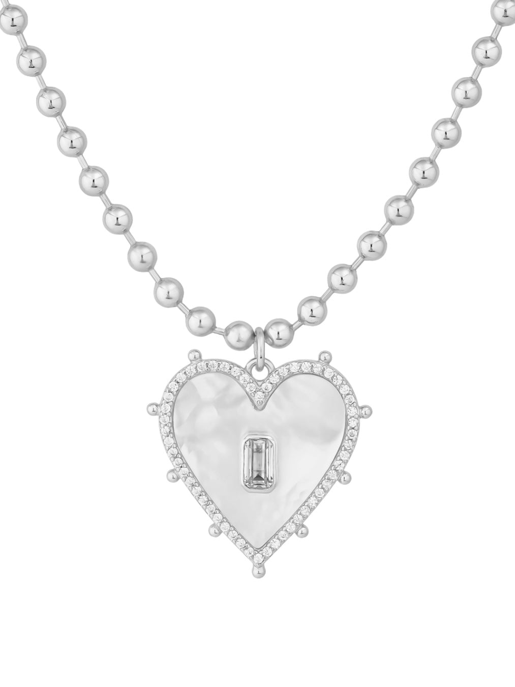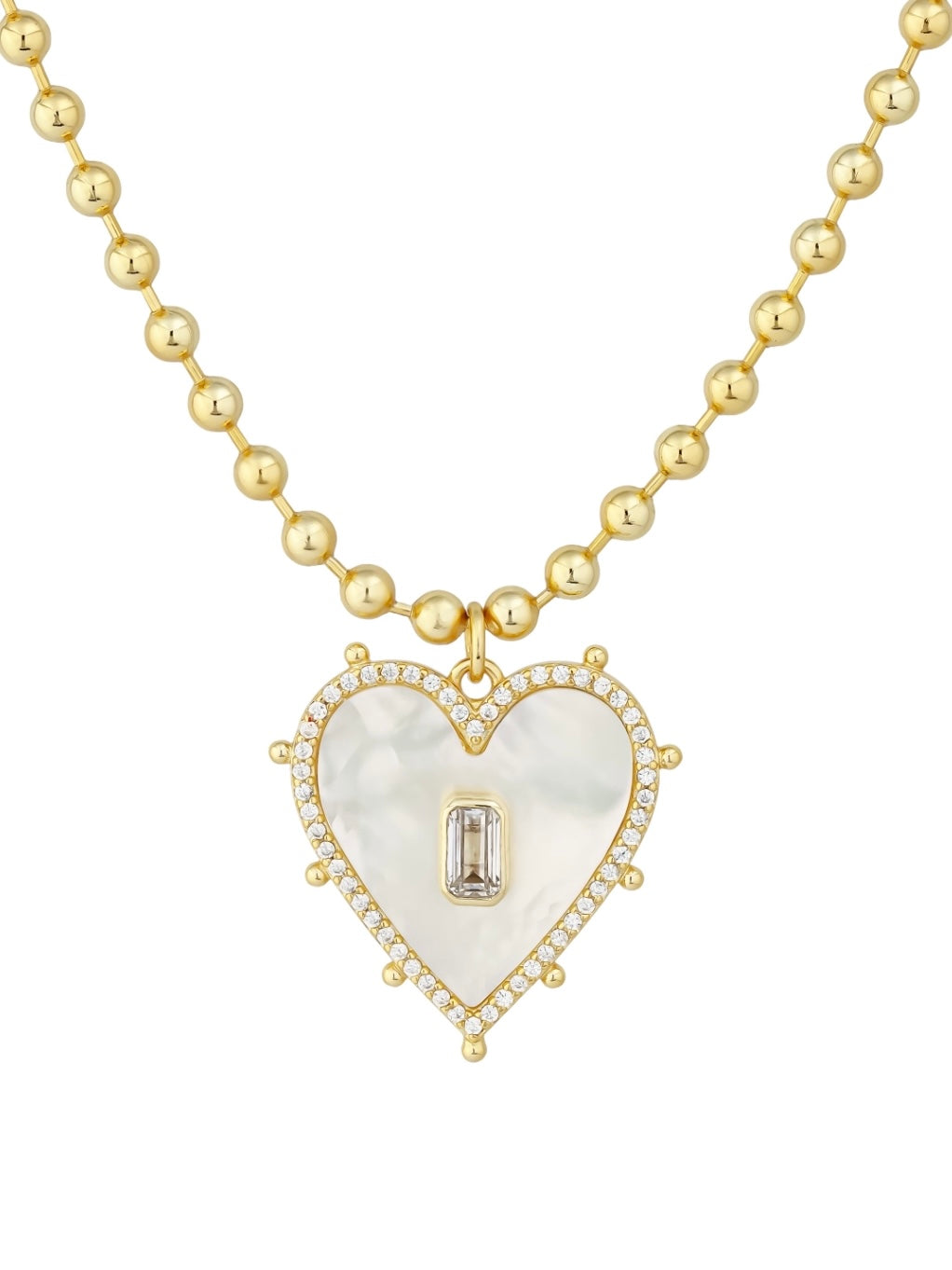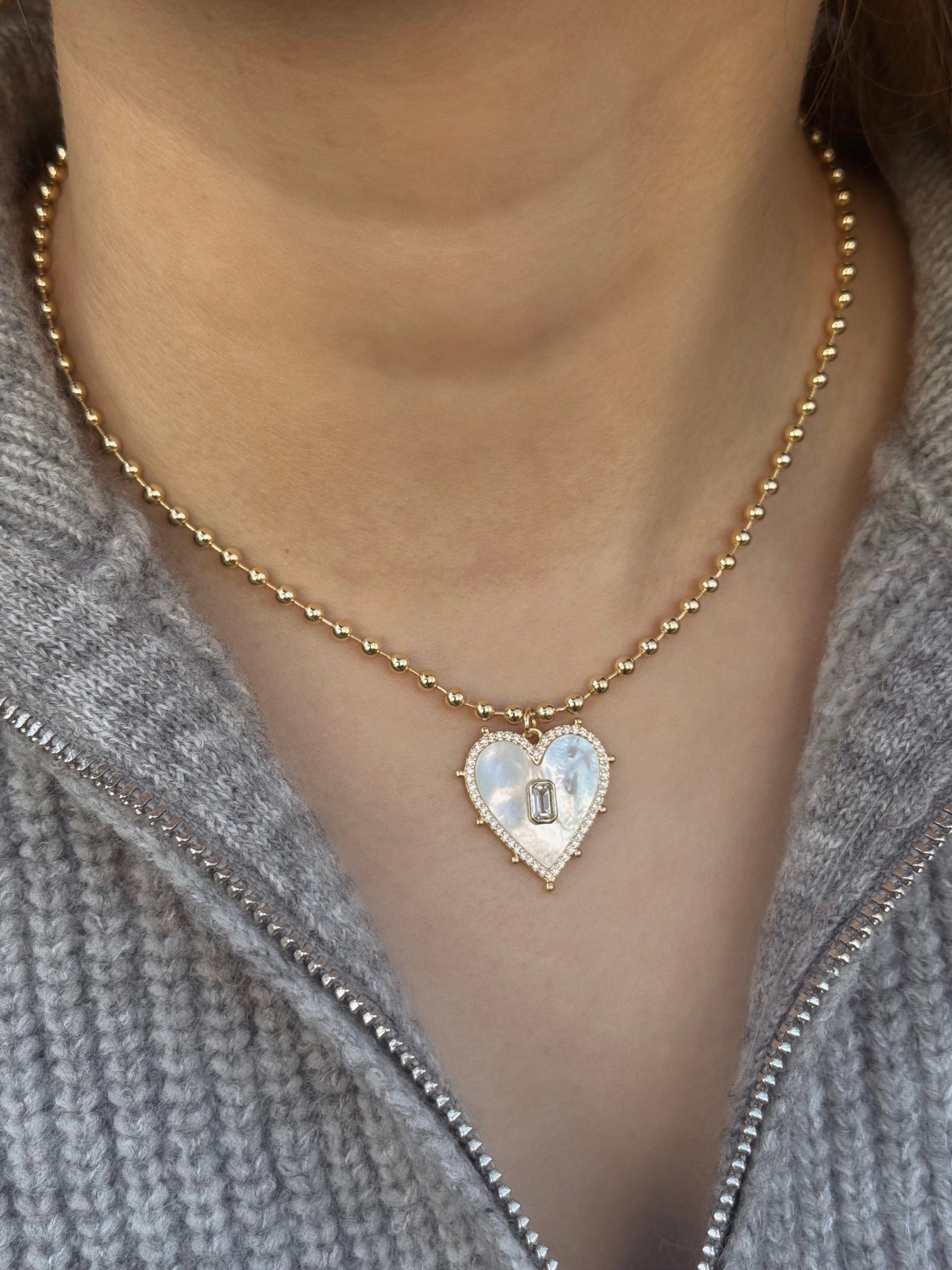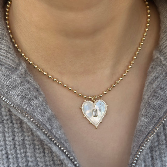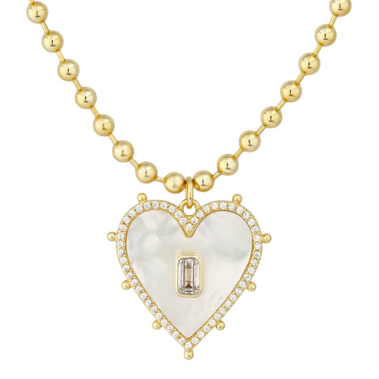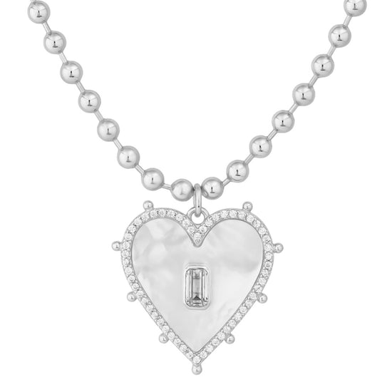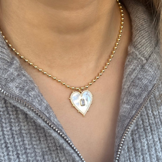 The Hailey Heart Necklace on a ball bead chain is your new everyday statement piece. Featuring stunning CZ stones and a mother of pearl heart, it’s the perfect go-to for adding a little love to any look.