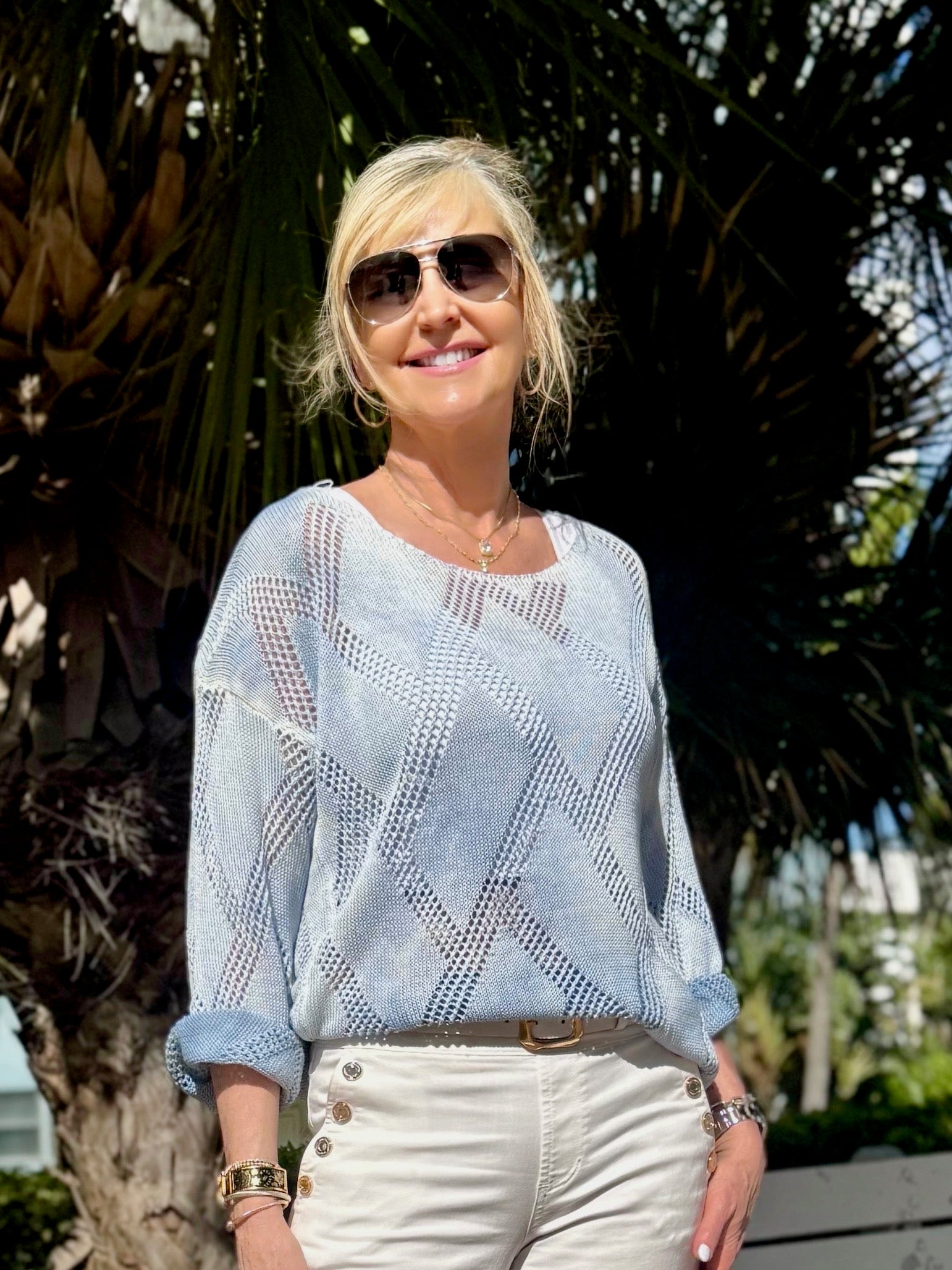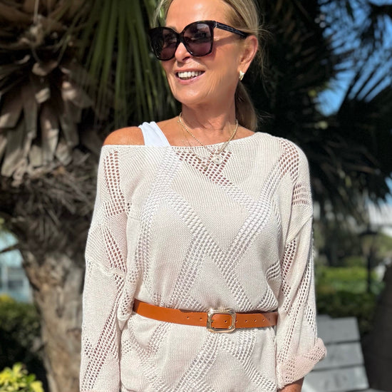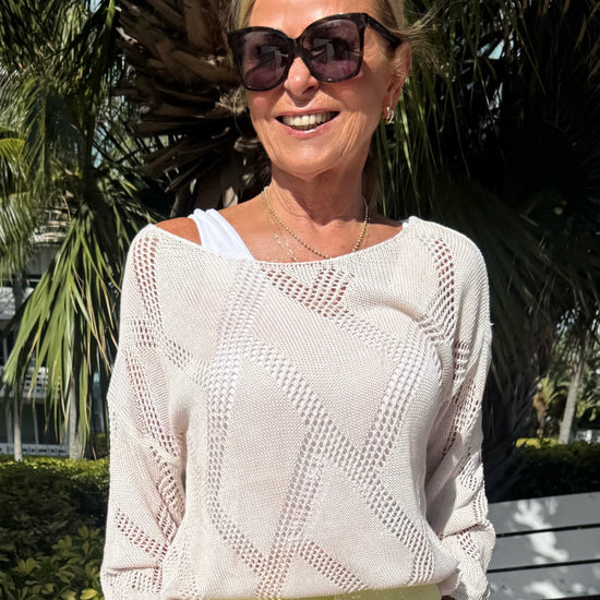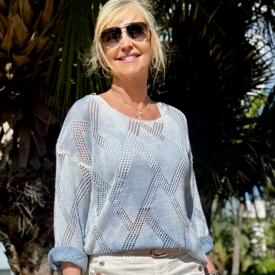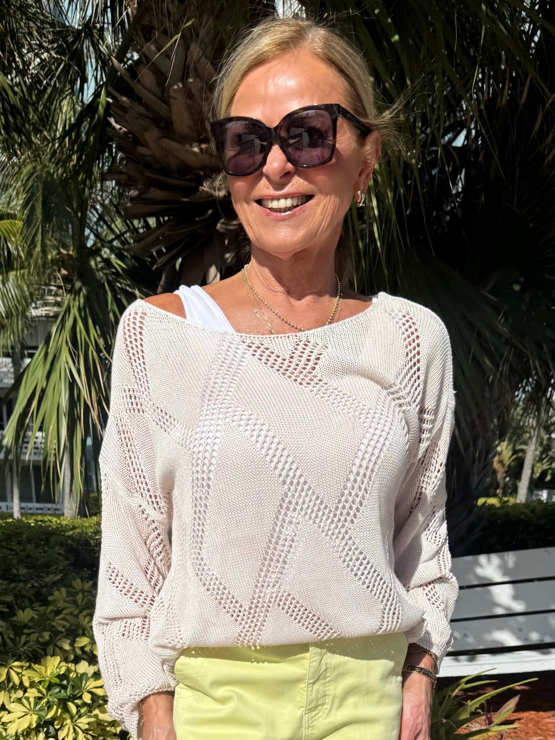 Effortlessly chic and beautifully breathable. This Italian-made knit is the definition of easy elegance. Designed in a soft, airy open-weave pattern, it drapes beautifully on the body while offering just the right amount of coverage. The relaxed silhouette, subtle boat neckline, and drop-shoulder sleeves create a flattering, laid-back shape that feels as good as it looks. The lightweight knit makes it perfect for layering over a cami or tank, giving you endless styling versatility from spring through fall.