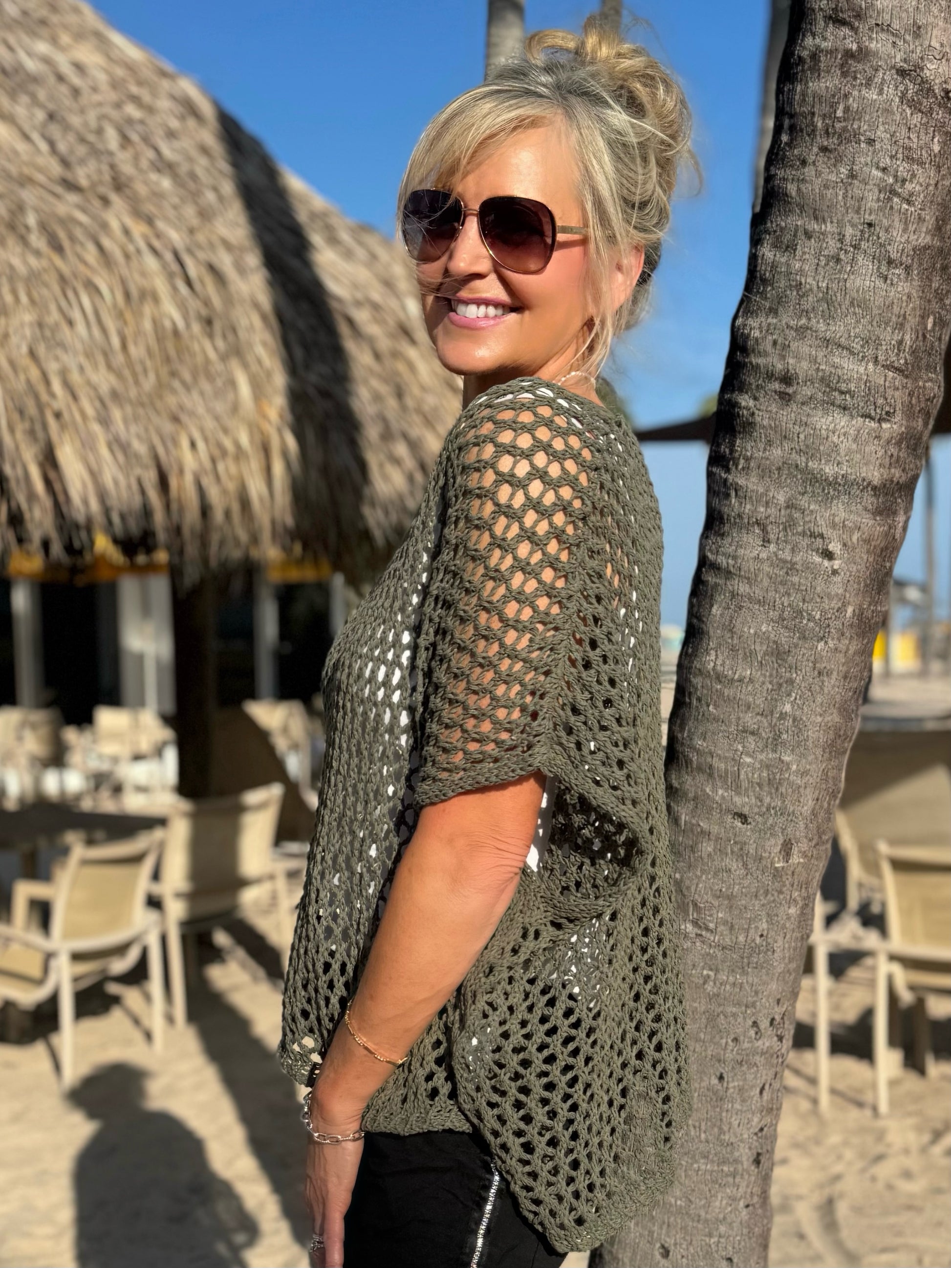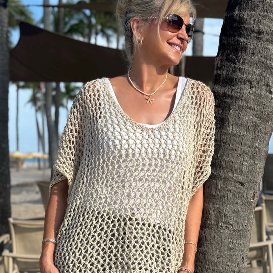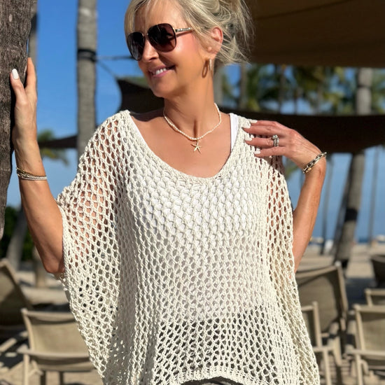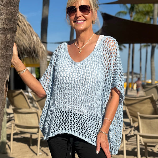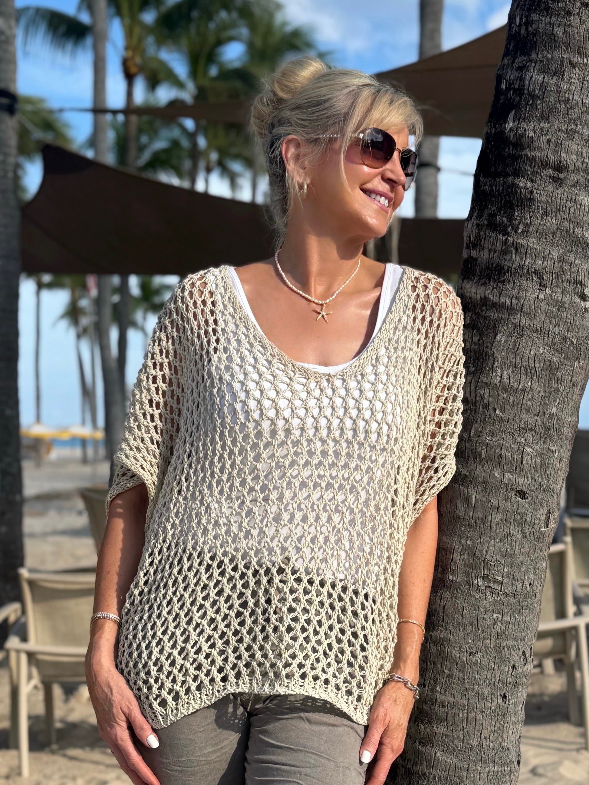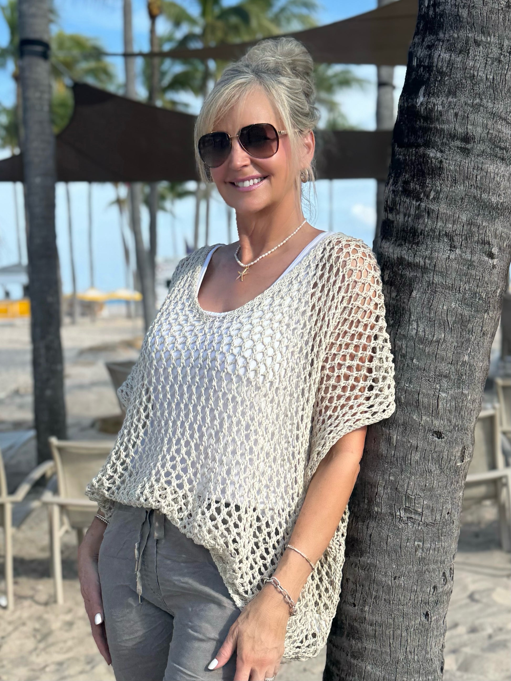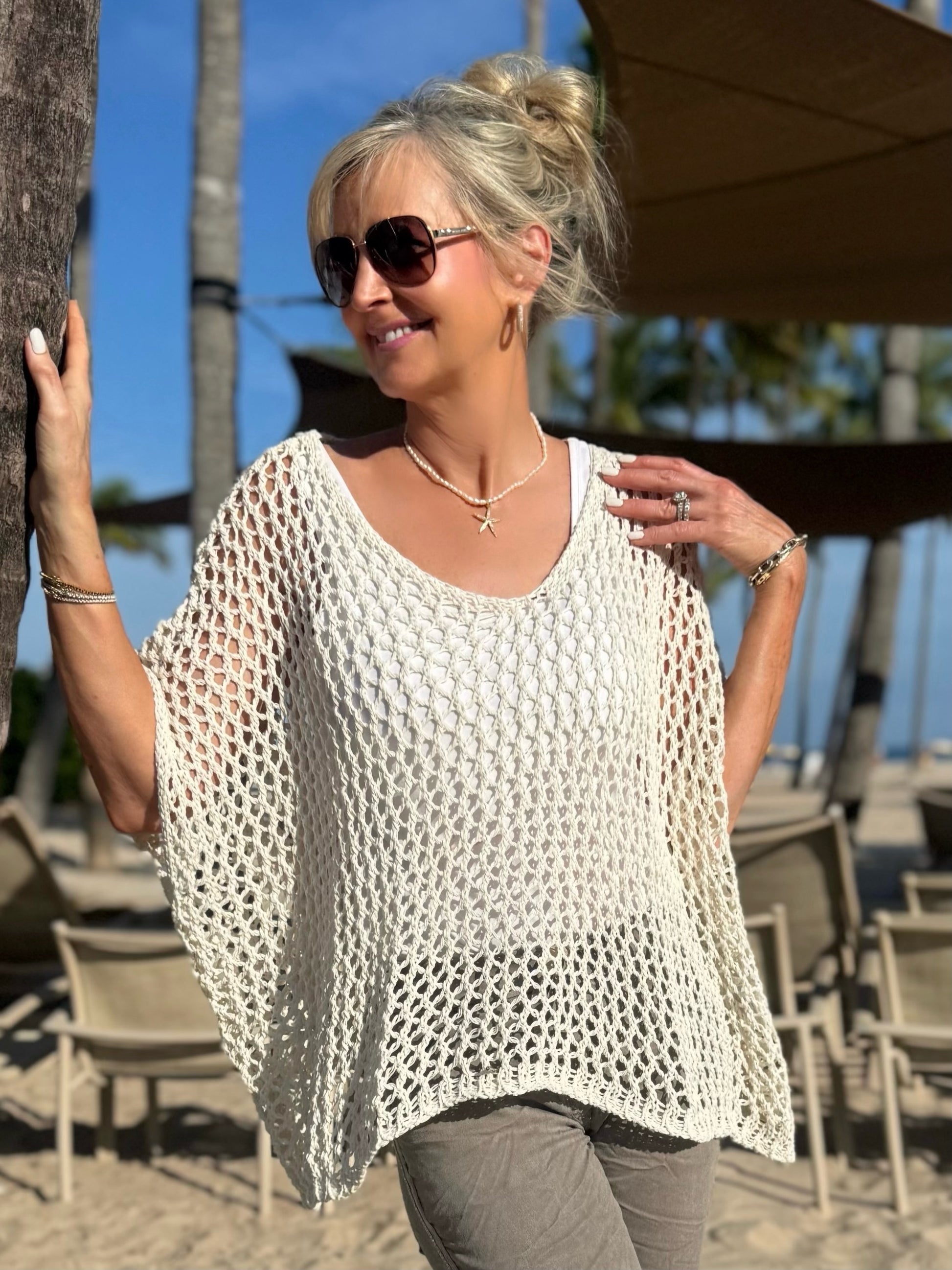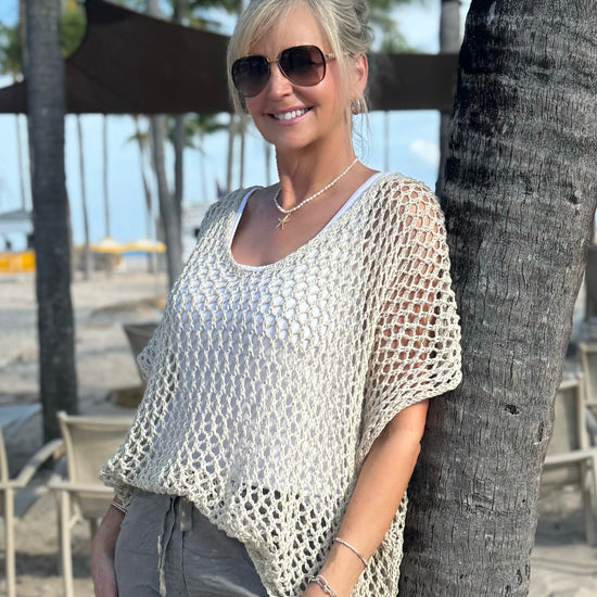 Light, airy, and effortlessly chic. This beautiful Italian-made crochet top features an open-weave knit with a relaxed, draped silhouette that flatters every body. Designed with wide, flowy sleeves and a soft scoop neckline, it’s perfect for layering over a cami or tank. The breathable cotton blend makes it ideal for warm days, beach getaways, or easy everyday wear. Dress it up with linen pants or keep it casual with denim for timeless, age-positive style.