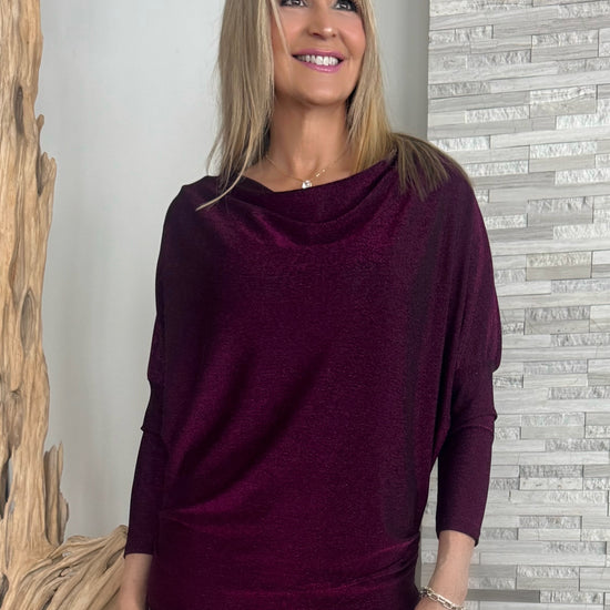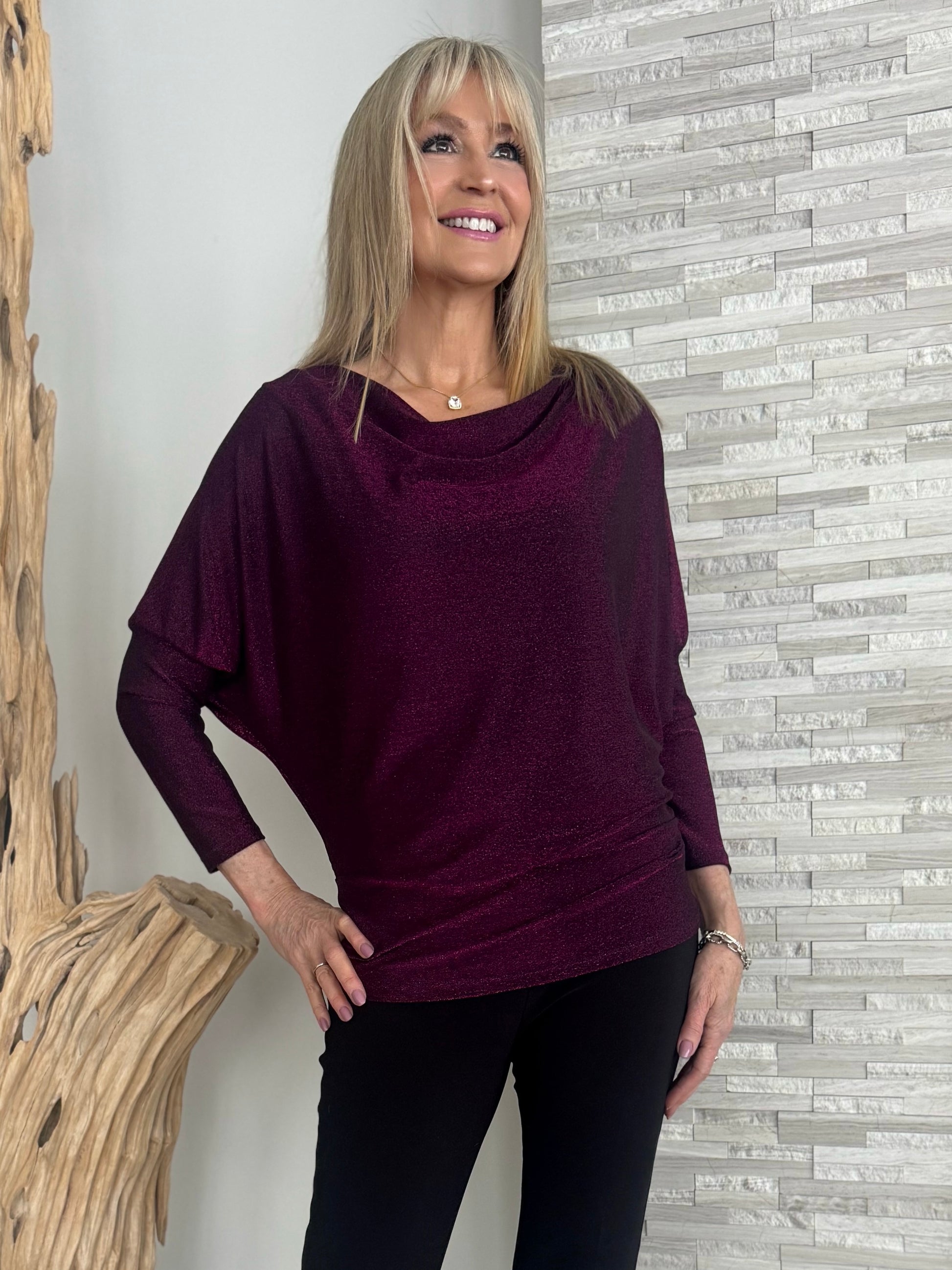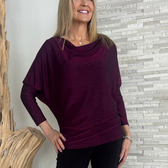 Effortless elegance with a touch of glam. This made in Italy shimmer dolman-sleeve top drapes beautifully with a soft cowl neckline that flatters the bust and adds a sophisticated, feminine touch. The relaxed dolman sleeves create a comfortable, easy fit through the arms and shoulders, while the fitted hem gently shapes the waist for a smooth, slimming effect.