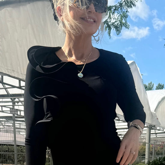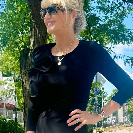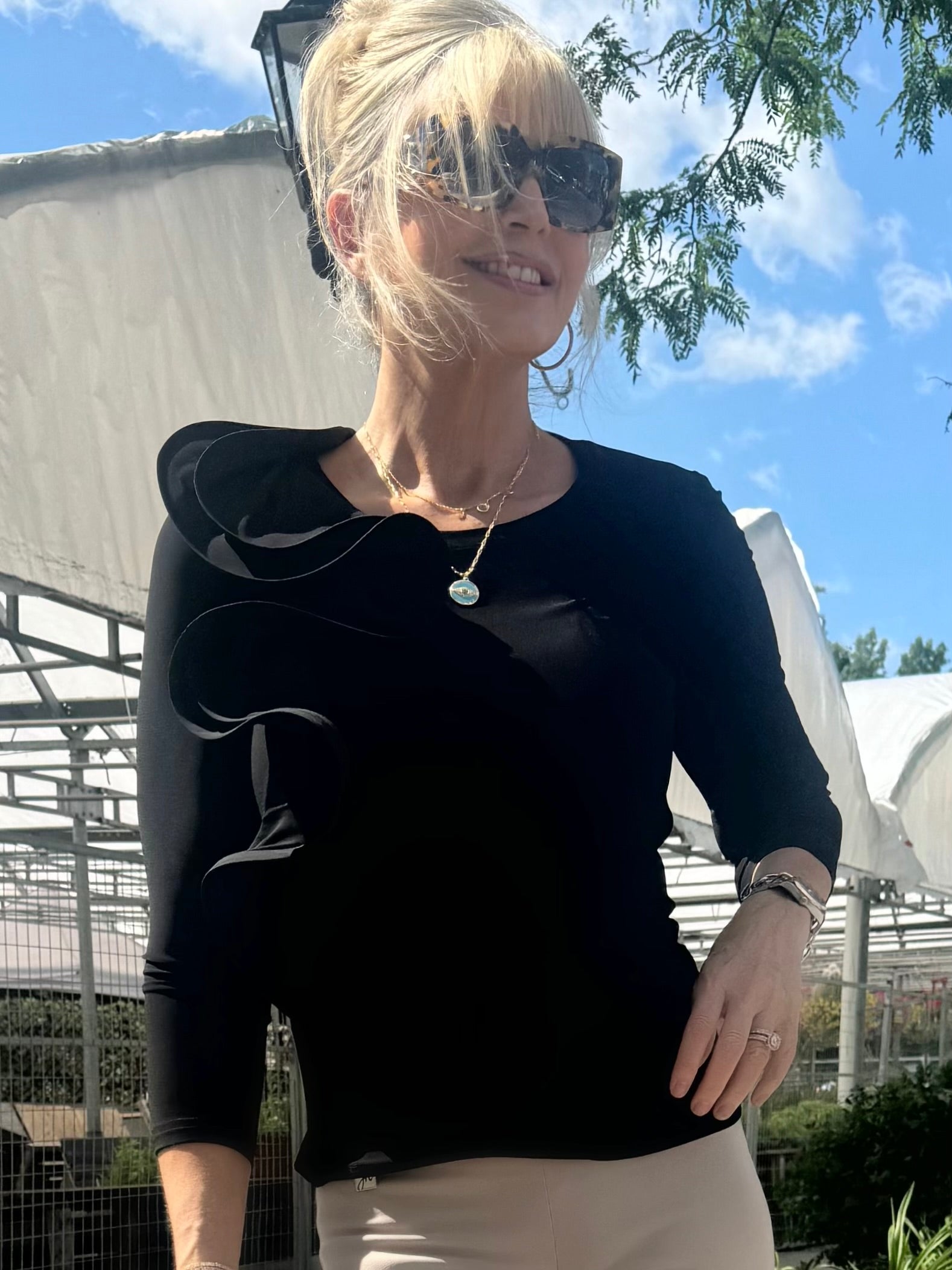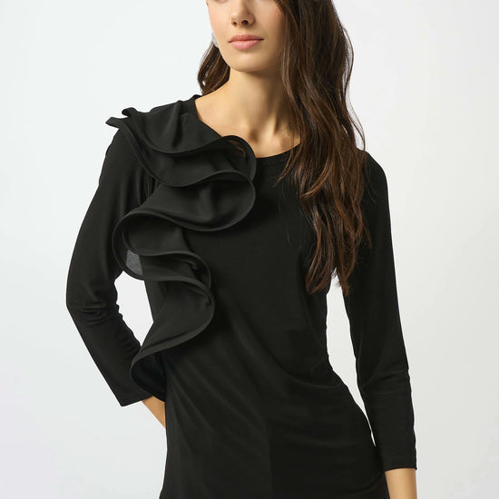 This silky knit top blends elegance and ease with its flattering scoop neckline and fitted silhouette. The classic three-quarter sleeves add timeless charm, while the front ruffled horsehair detail in solid georgette brings a soft, textured touch that gracefully continues over the back shoulder.