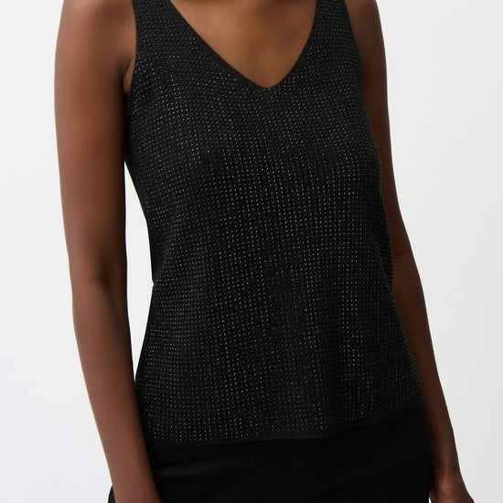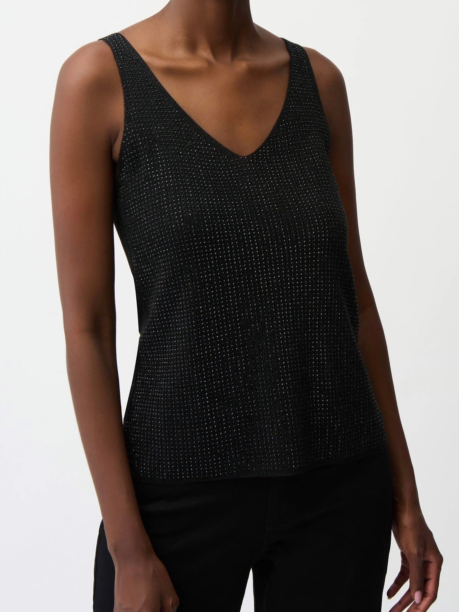 Get ready to dazzle at your next event in this sleeveless camisole. Crafted from a ribbed sweater knit blended with shimmering metallic fibres, it’s designed to catch the light and all the attention. The flattering V-neckline in both the front and back, paired with iron-on detailing, makes this top perfect for any party or night out.