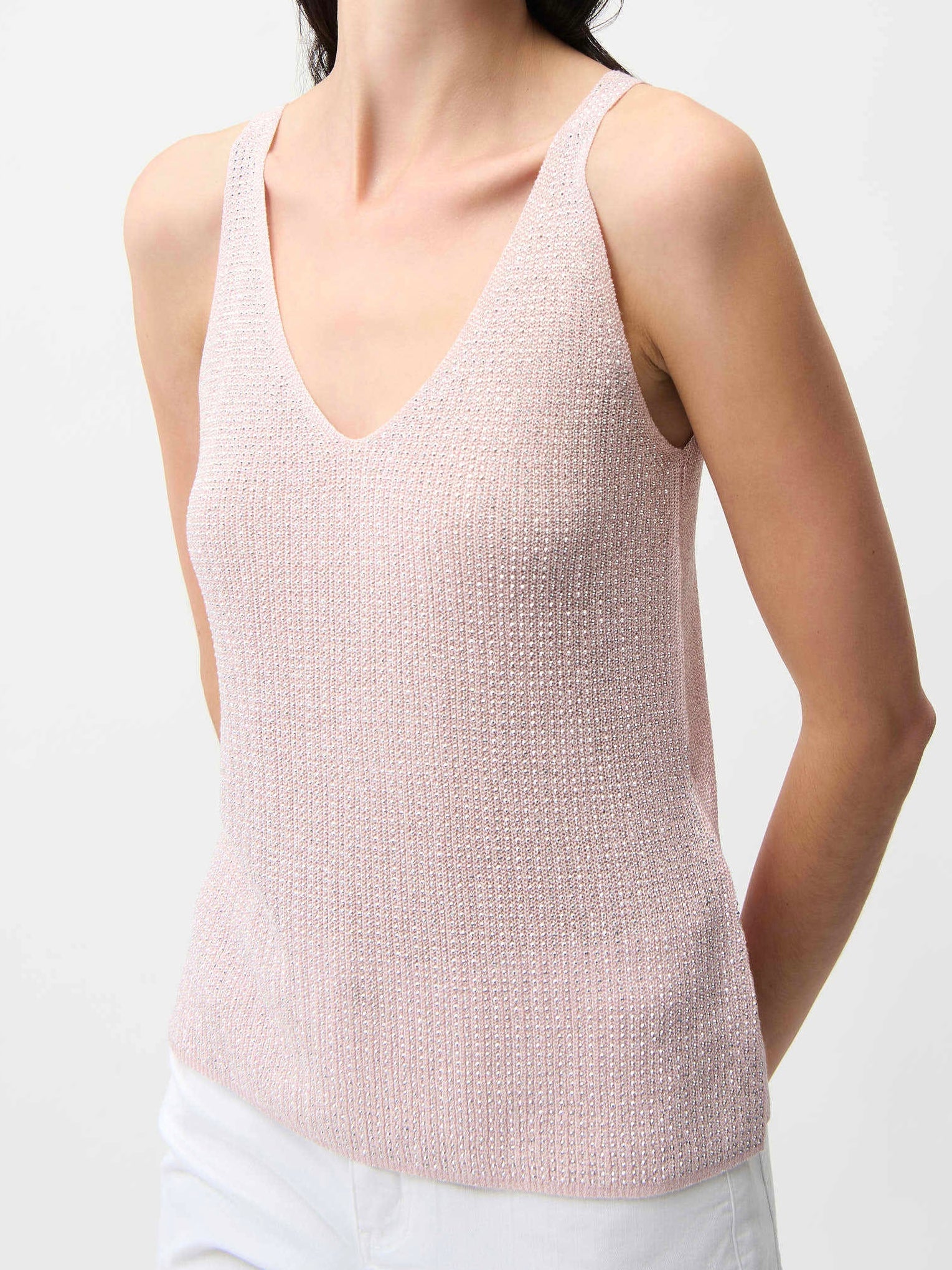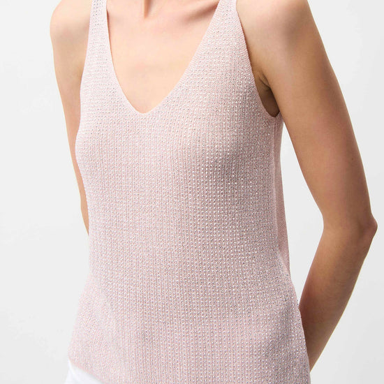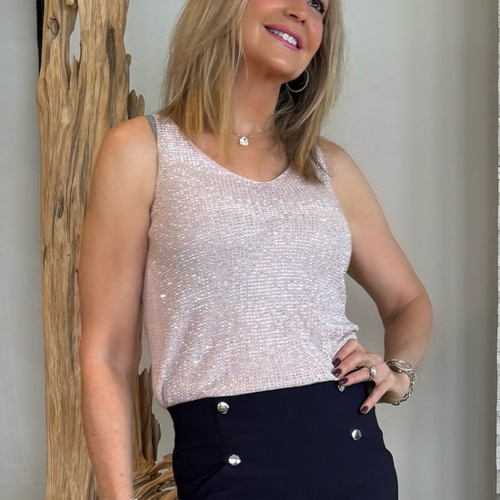 Get ready to dazzle at your next event in this sleeveless camisole. Crafted from a ribbed sweater knit blended with shimmering metallic fibres, it’s designed to catch the light and all the attention. The flattering V-necklineline in both the front and back, paired with iron-on detailing, makes this top perfect for any party or night out. XS to XL is on backorder until Jan 31st.