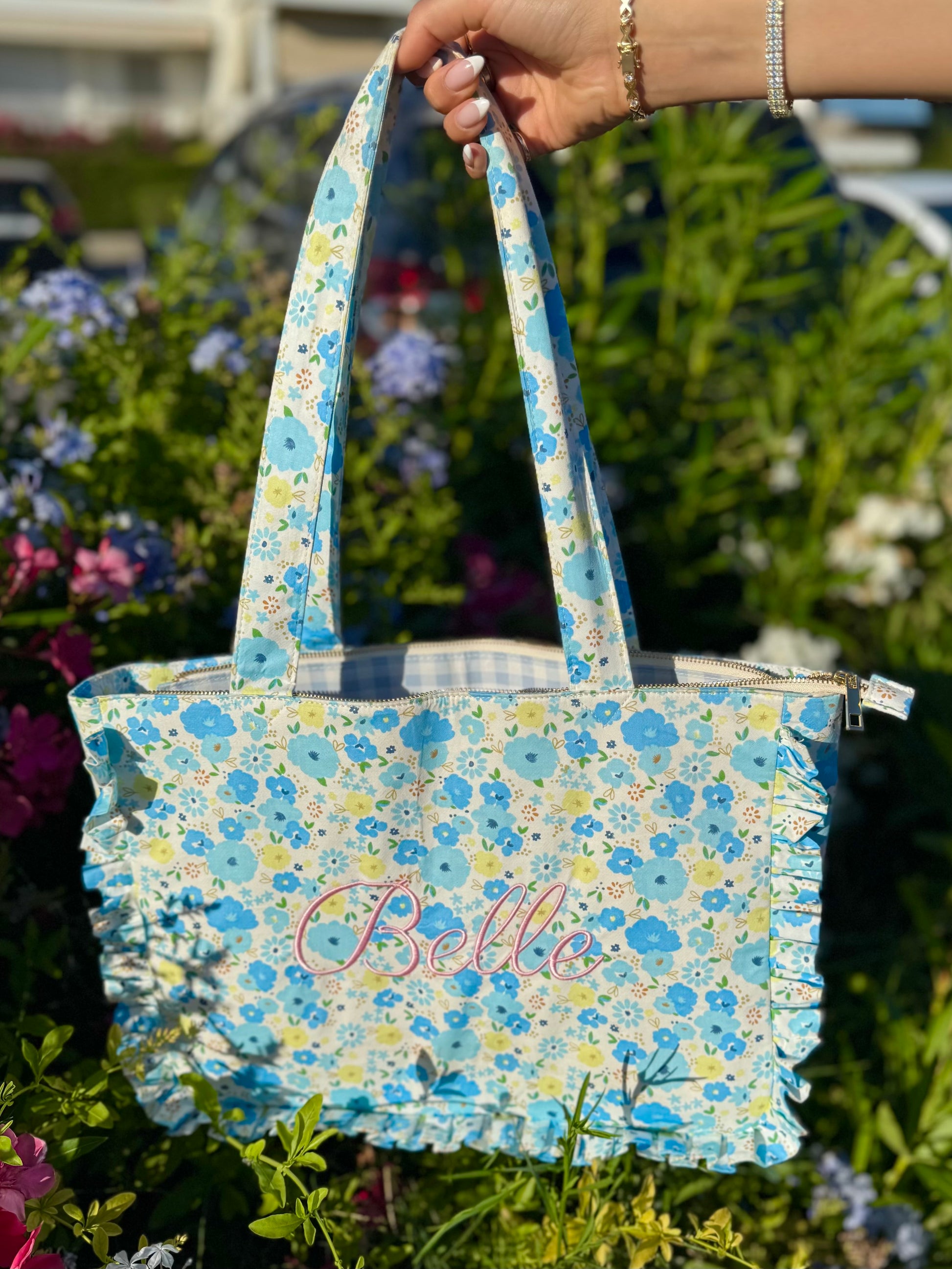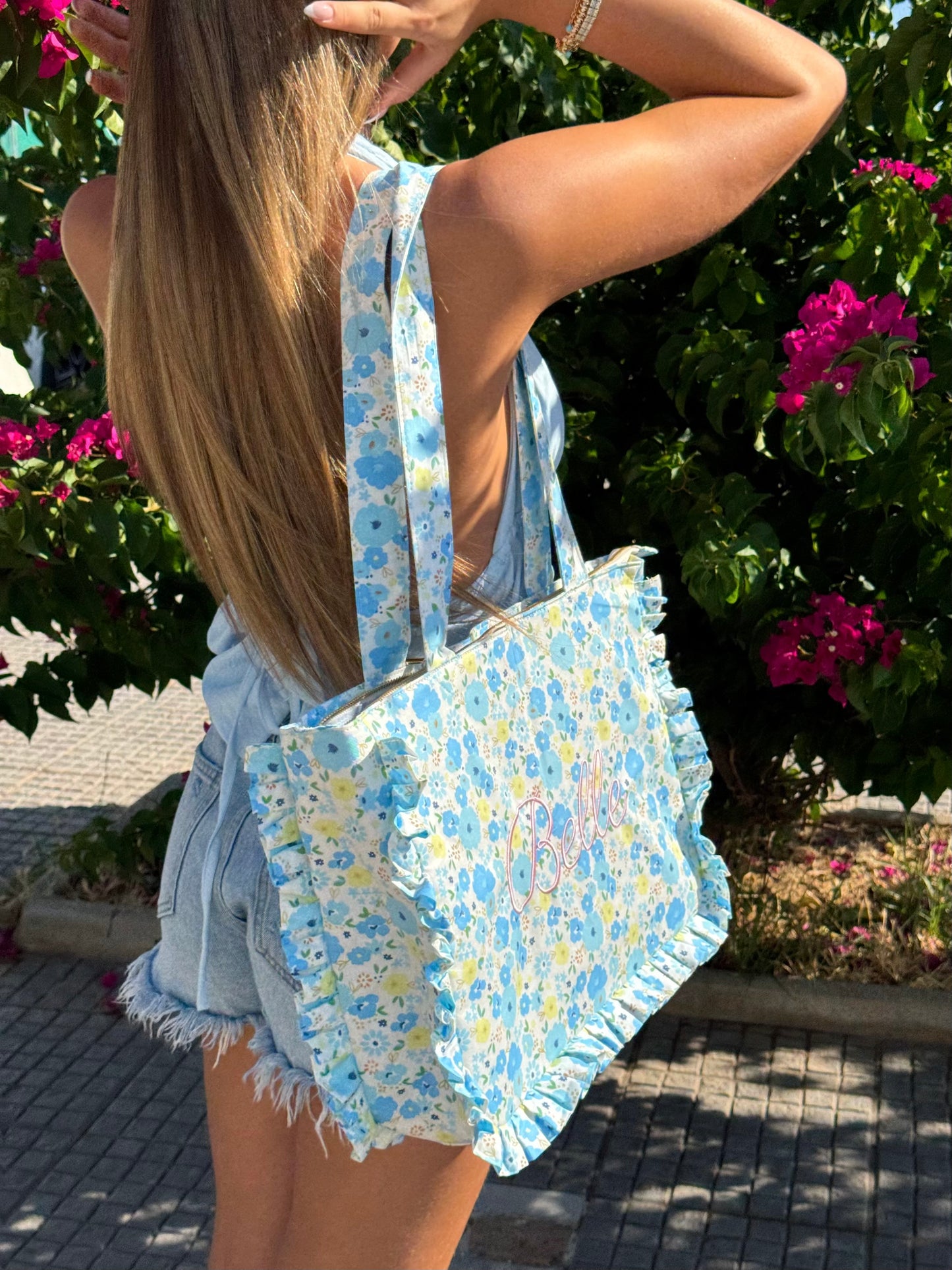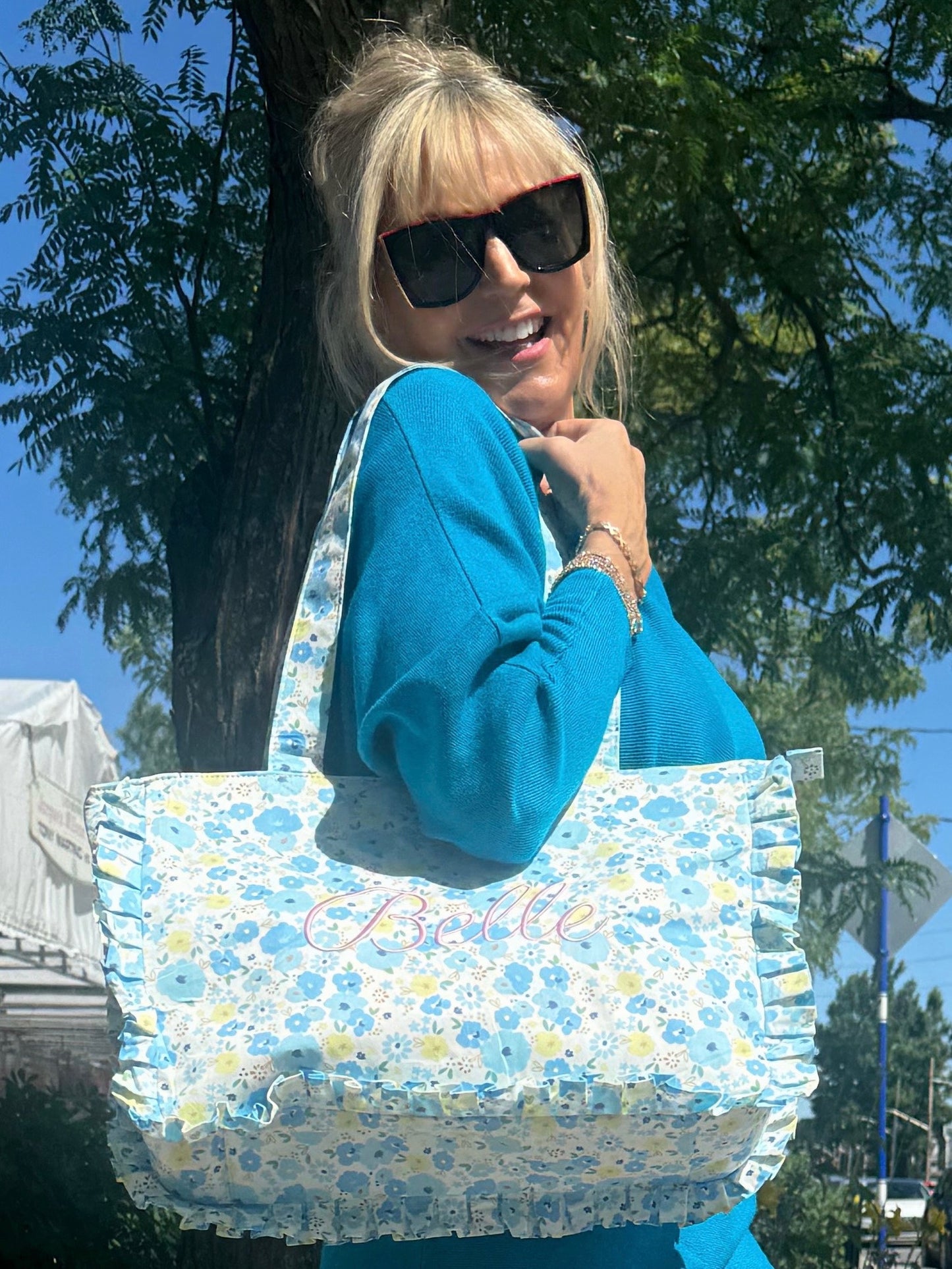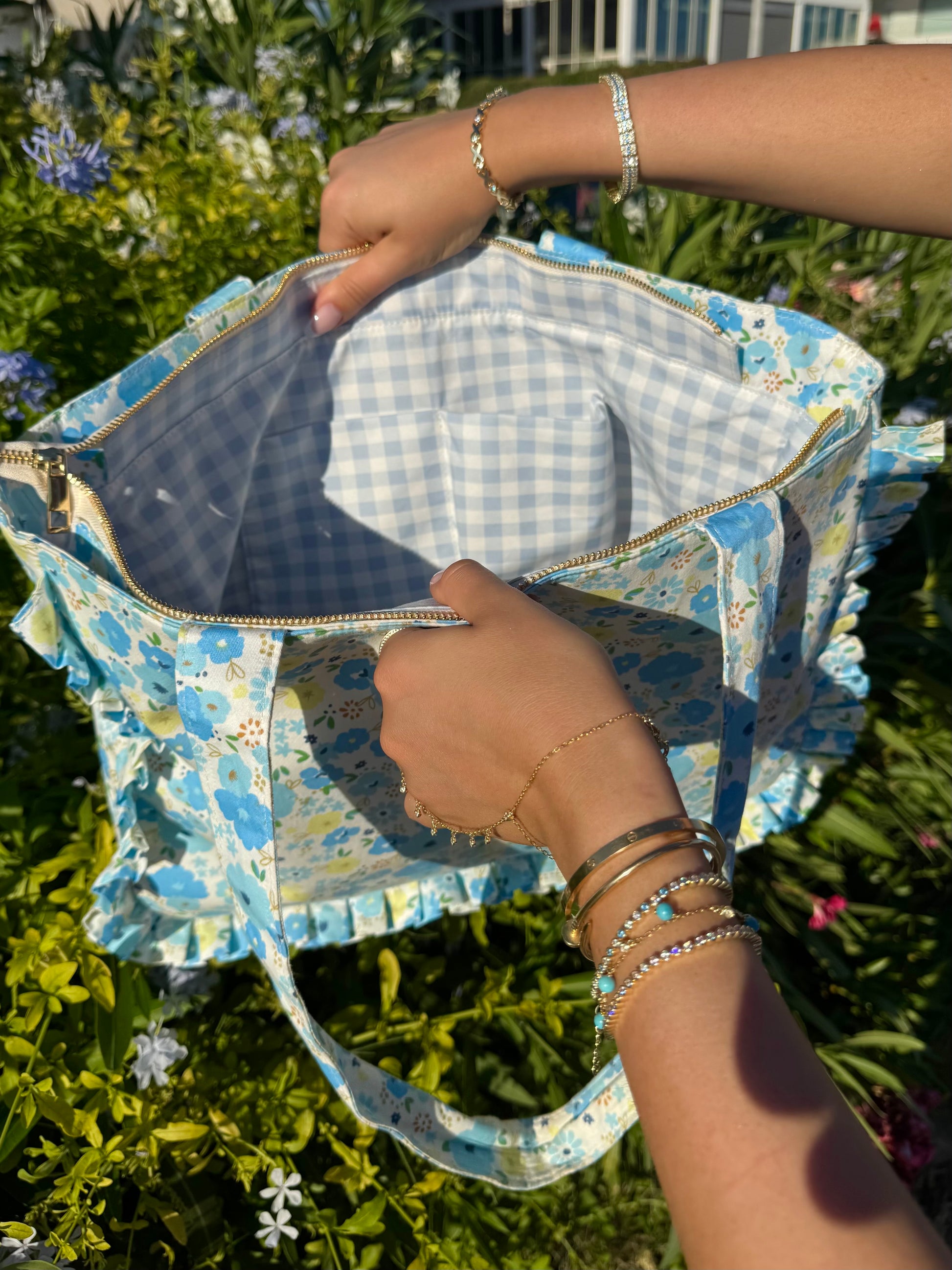 A dreamy floral tote made for market mornings and coastal escapes ๐ This bag matches our Milos Makeup Bag and brings the same island-inspired charm in a larger, everyday carry-all. Lightweight, roomy, and finished with delicate ruffle trim, a zipper top, and a blue gingham plaid interior, itโs perfect for your laptop, beauty pouches, or beach day must-haves.