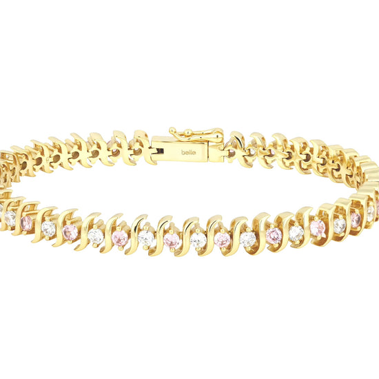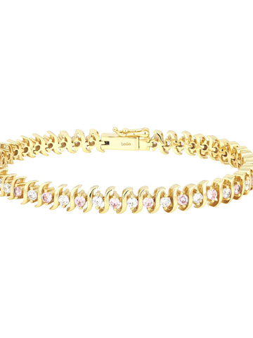 Crafted with soft s-shaped links and alternating baby pink + clear cz stones, this dreamy piece flows like a wave — delicate, feminine, and just bold enough. made with 14k gold vermeil over sterling silver, she’s the perfect statement for your everyday stack.
