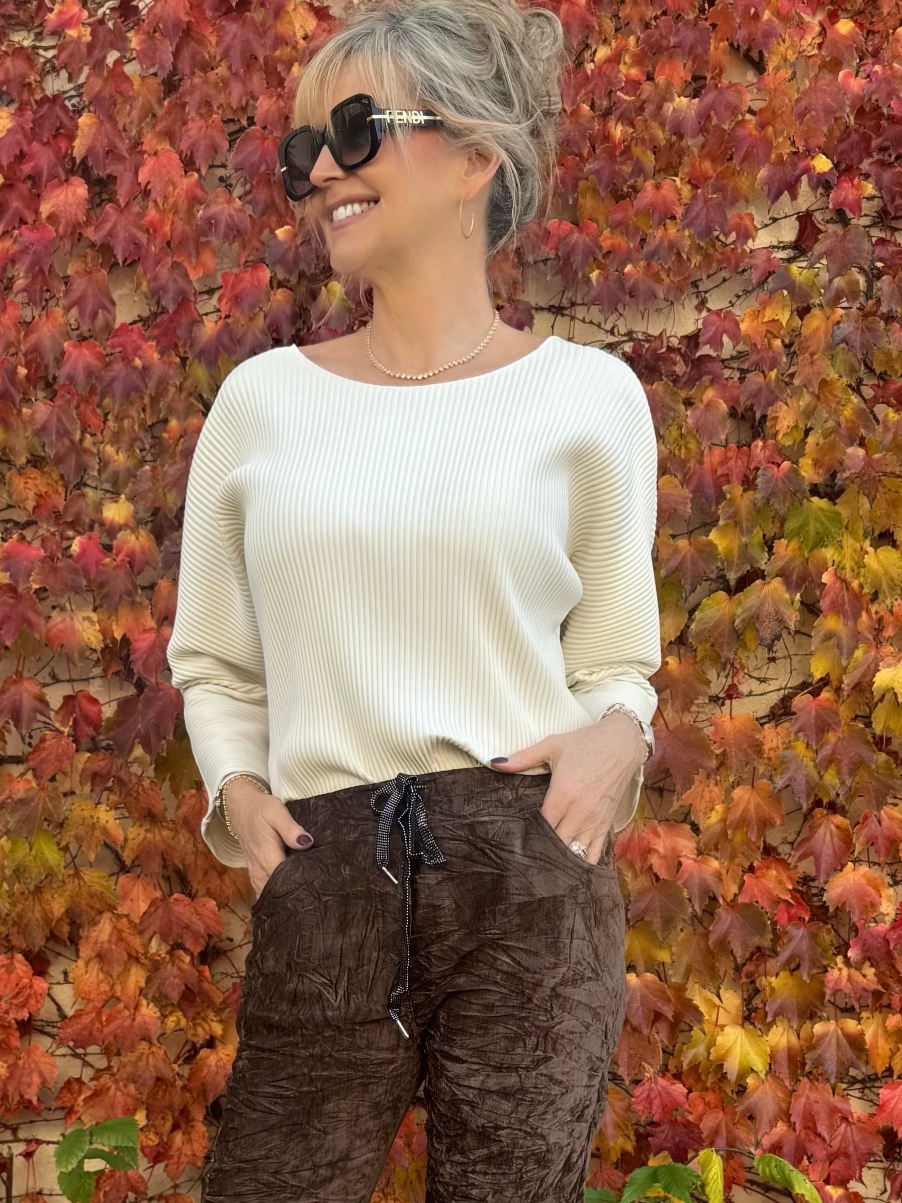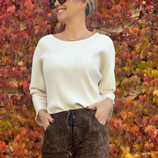 Delicate pleating adds a playful, feminine touch to this casual top. Crafted from lightweight scuba crepe, it features a flattering scoop neckline, three-quarter dolman sleeves, and a relaxed silhouette for effortless elegance and comfort.
