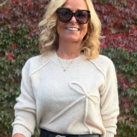 Soft, feminine, and effortlessly chic! This knit sweater features a sube bow detail that adds the perfect touch of charm. Designed with a classic crew neckline and a relaxed fit, it’s cozy yet polished for everyday wear. Pair it with your favourite jeans or cords for an elevated casual look all season long.