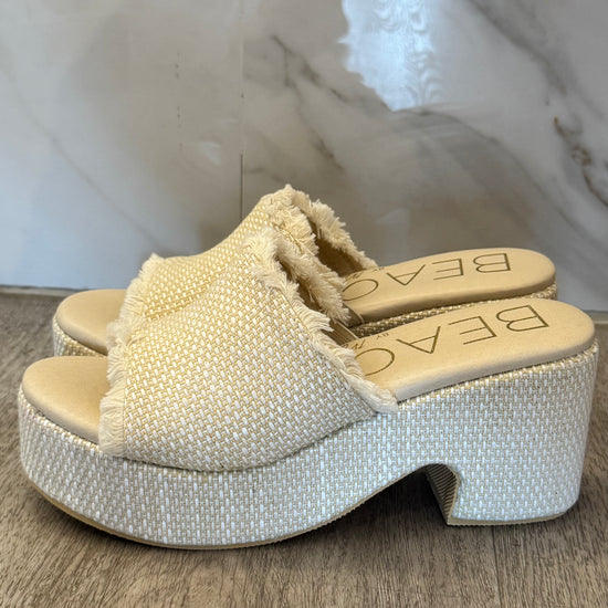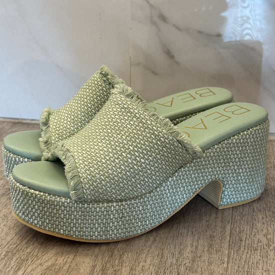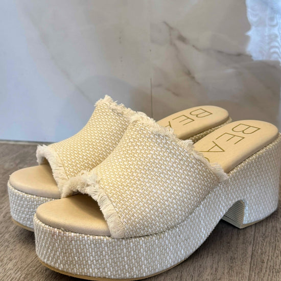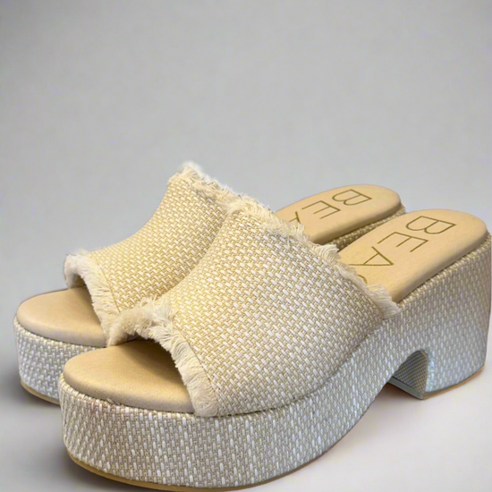 A stunning wedge with a slight heel, featuring intricate knit fabric details and subtle frayed accents.