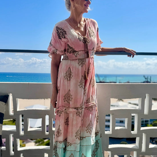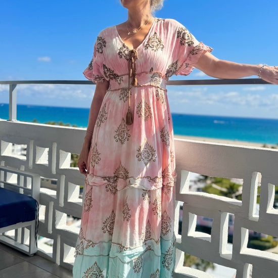Effortless, feminine, and oh-so-flattering 💗 This stunning maxi dress features an elasticized empire waist that enhances your shape while keeping you comfortable all day long. The decorative drawstring detail adds a stylish touch, while subtle gold accents woven into the print give it that extra glow. Beautiful colour shading throughout creates dimension and movement, complemented by soft ruffle detailing along the hem and sleeves for a romantic finish. Lightweight and flowy, it’s the perfect piece for vacations, special occasions, or simply feeling beautiful every day. Pre-order for March 15th approx.