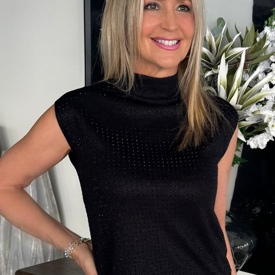 This versatile sleeveless pullover is a chic addition to your occasion wardrobe, featuring a sophisticated mock neck and elegant iron-on detailing. Crafted from a soft sweater knit in a flattering straight fit, it pairs beautifully with a variety of bottoms for a polished look.