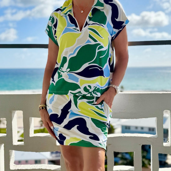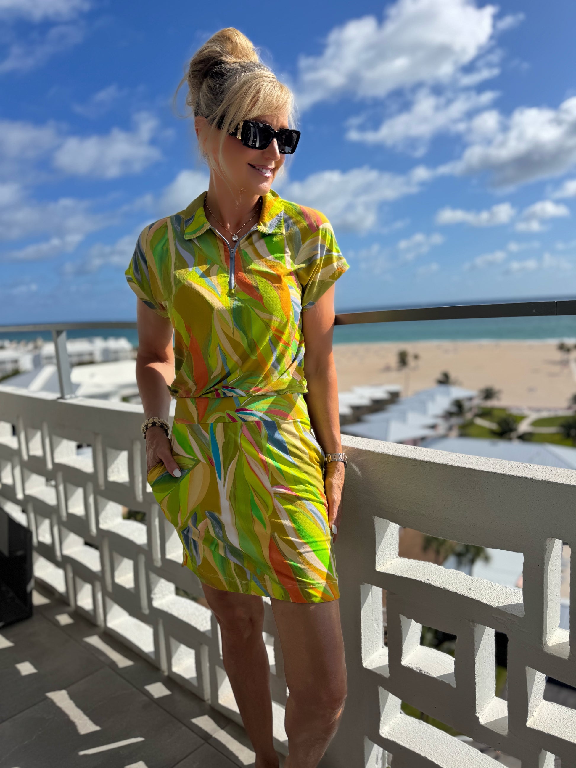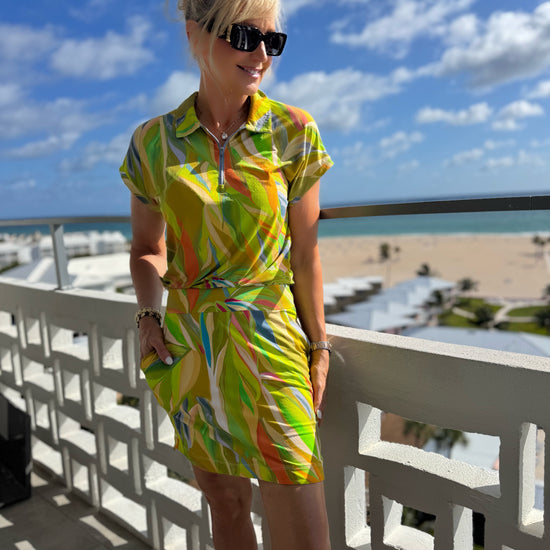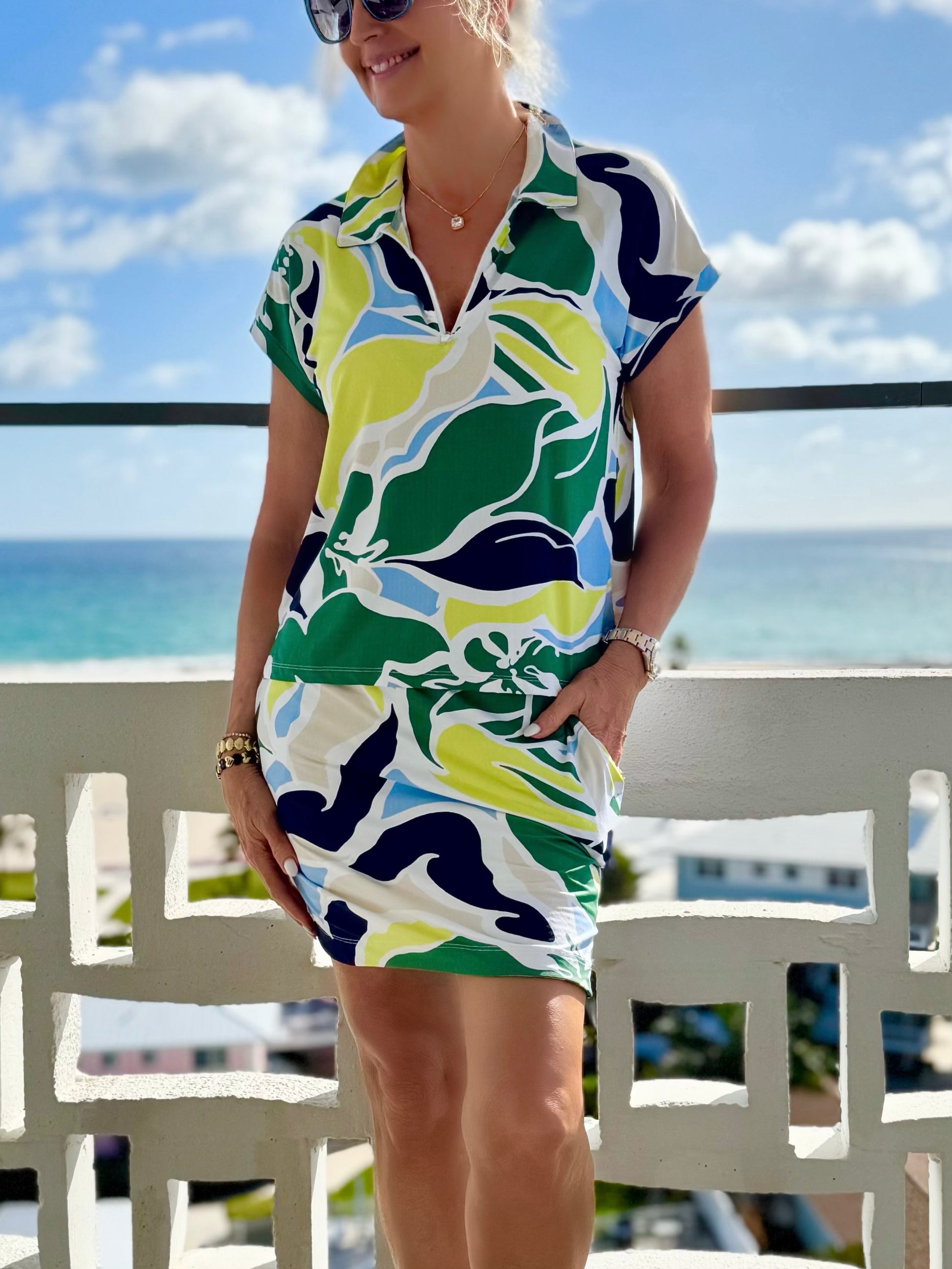 A vibrant skort designed for effortless movement and standout style. Featuring a smooth pull-on waistband for a flattering, comfortable fit, it’s detailed with functional zip pockets and a modern rounded hem for a sleek finish. Built-in shorts provide confident coverage and all-day ease, while the bold brushstroke print delivers a fresh, tropical energy to your everyday look. Made with SPF 50 protection for added sun-smart style.