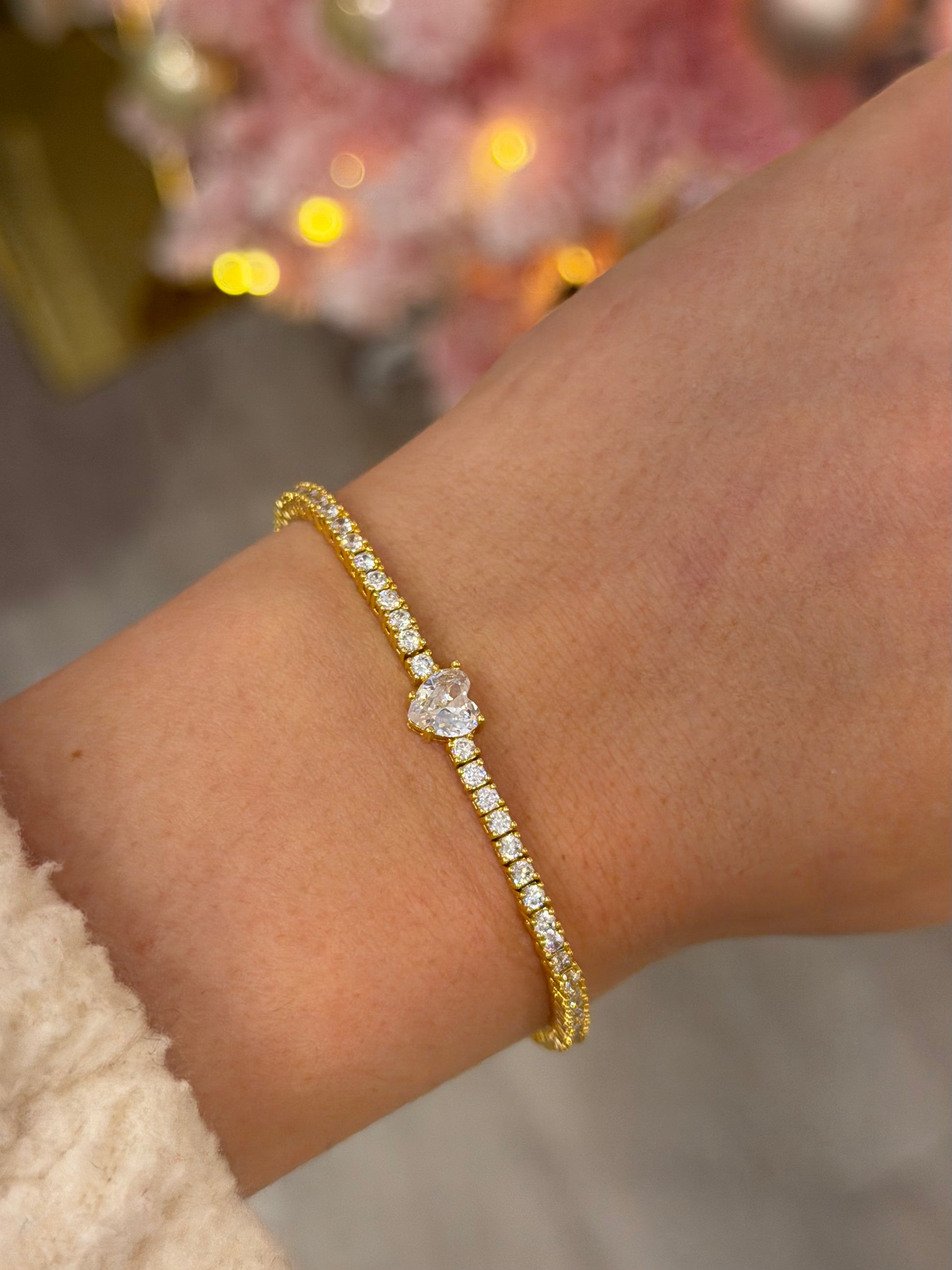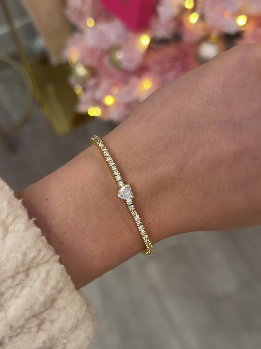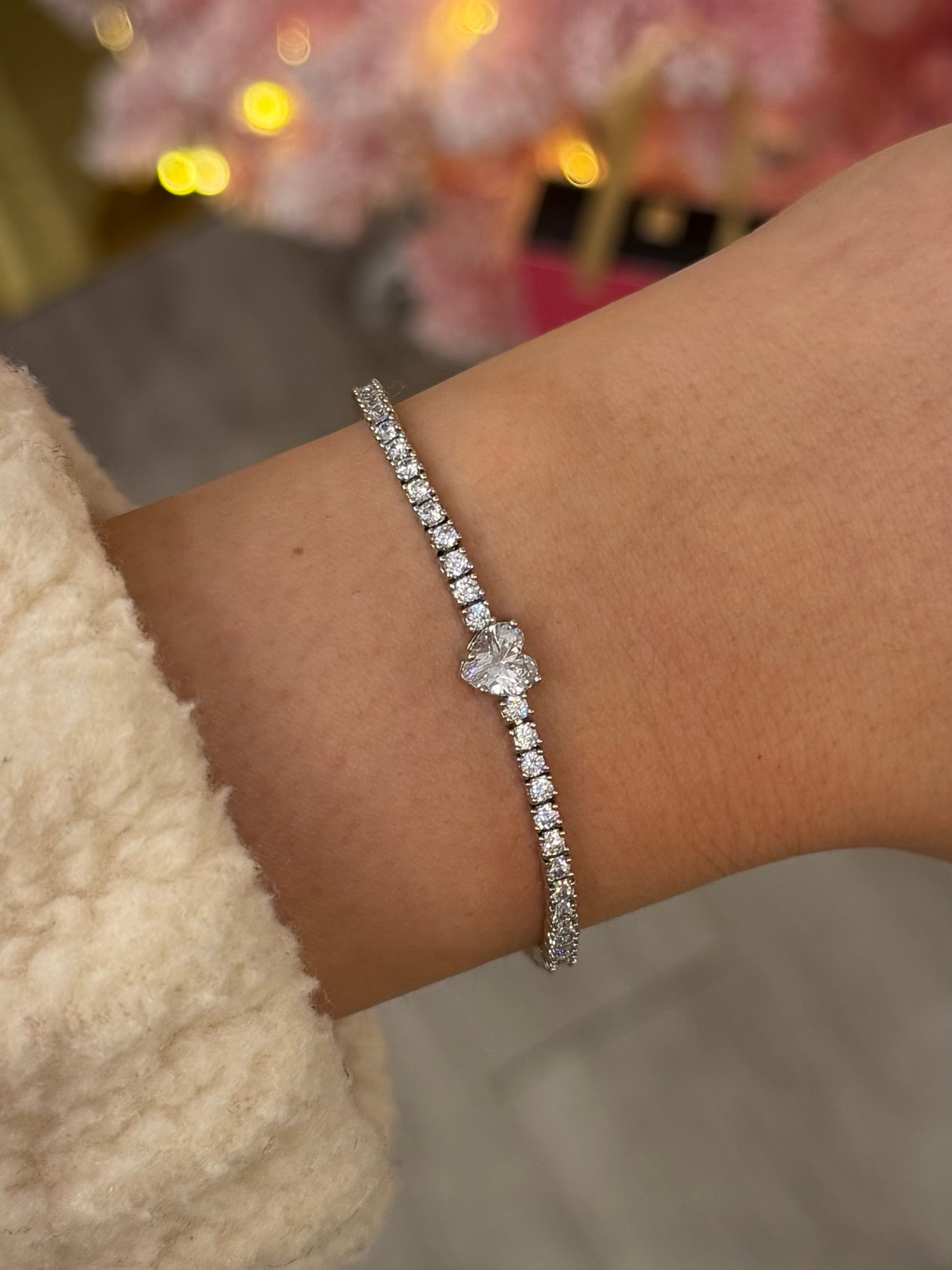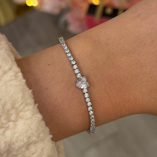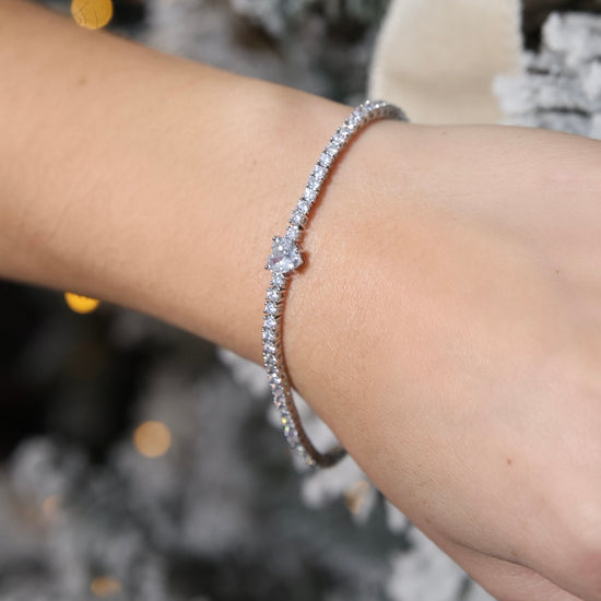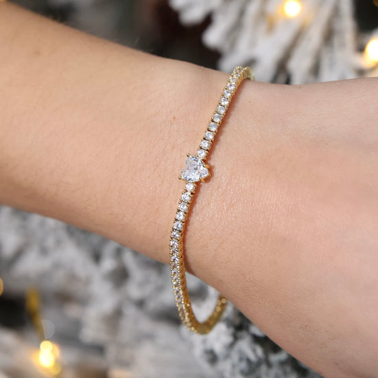 Introducing the Romantic Belle Tennis Bracelet. A timeless symbol of love and elegance. Featuring a delicate heart detail surrounded by shimmering CZ stones, this bracelet captures the perfect balance of romance and sophistication.