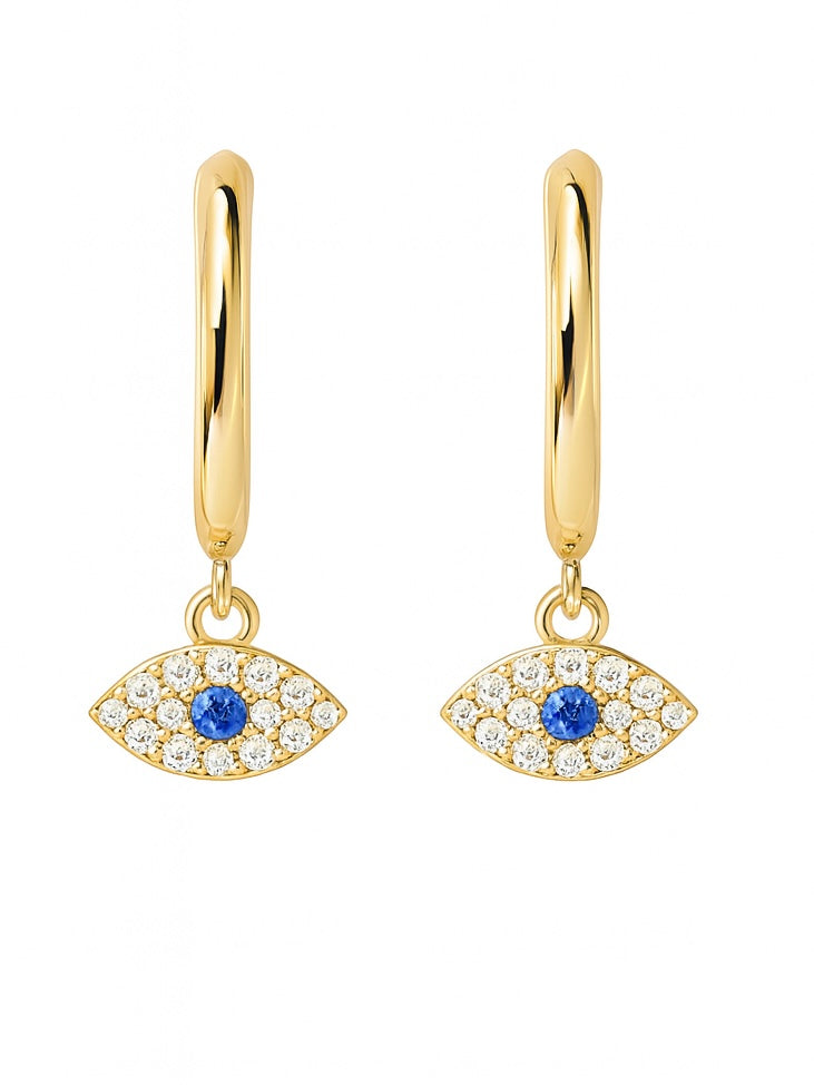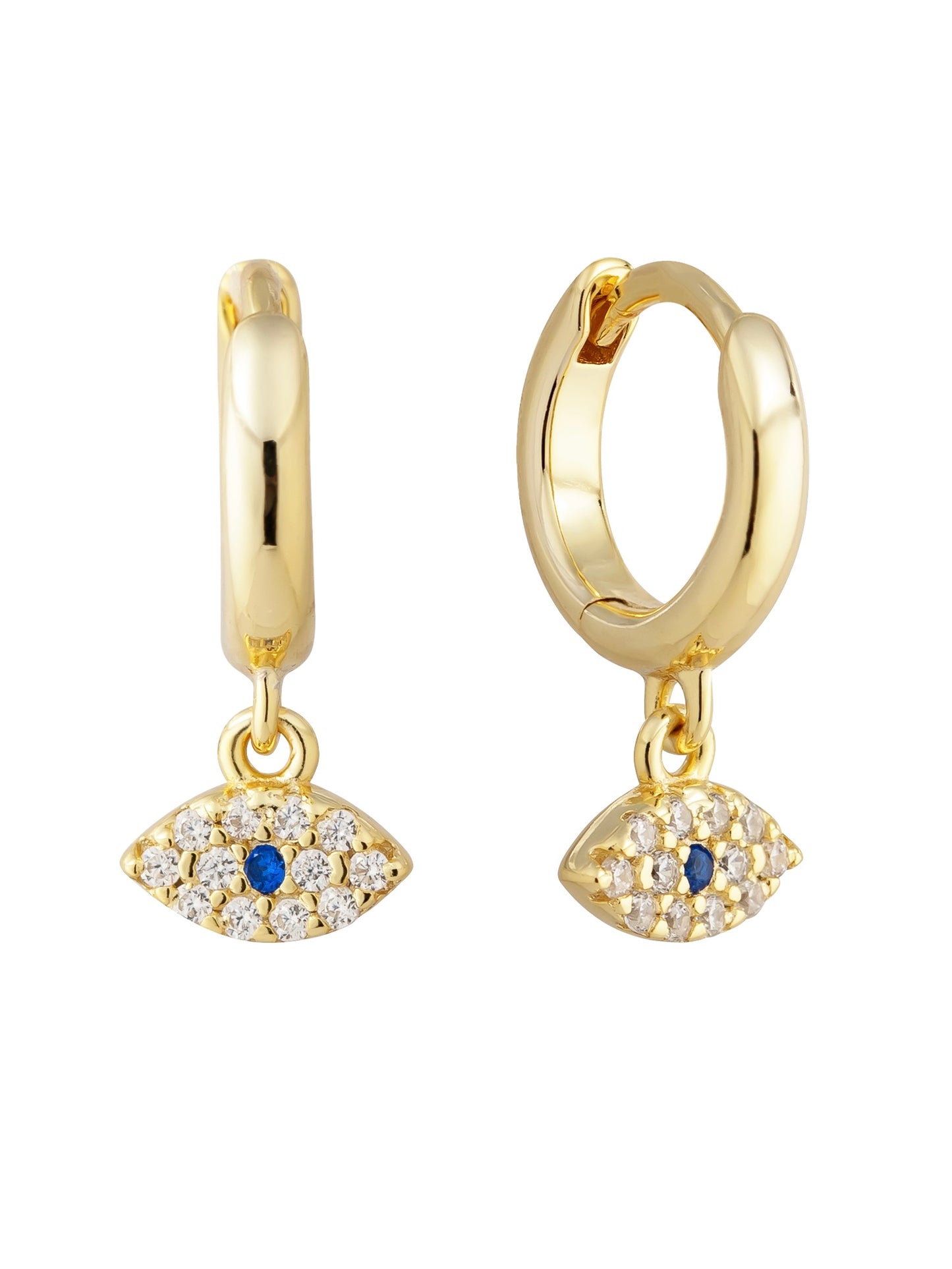 Your daily dose of sparkle and protection. The Santorini Hoops feature mini evil eye charms made with pavé CZ stones and a bold blue center — all suspended from sleek gold vermeil huggie hoops. Dainty, powerful, and made to shine.
