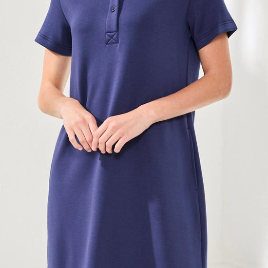 Sporty yet sophisticated, this short-sleeve polo dress is crafted from advanced Techno Lux soft scuba fabric, delivering modern stretch and exceptional comfort. Featuring a classic polo collar, button placket, and straight fit with side slits, it offers an easy, flattering silhouette. Perfect for active days, travel, or effortless everyday style.