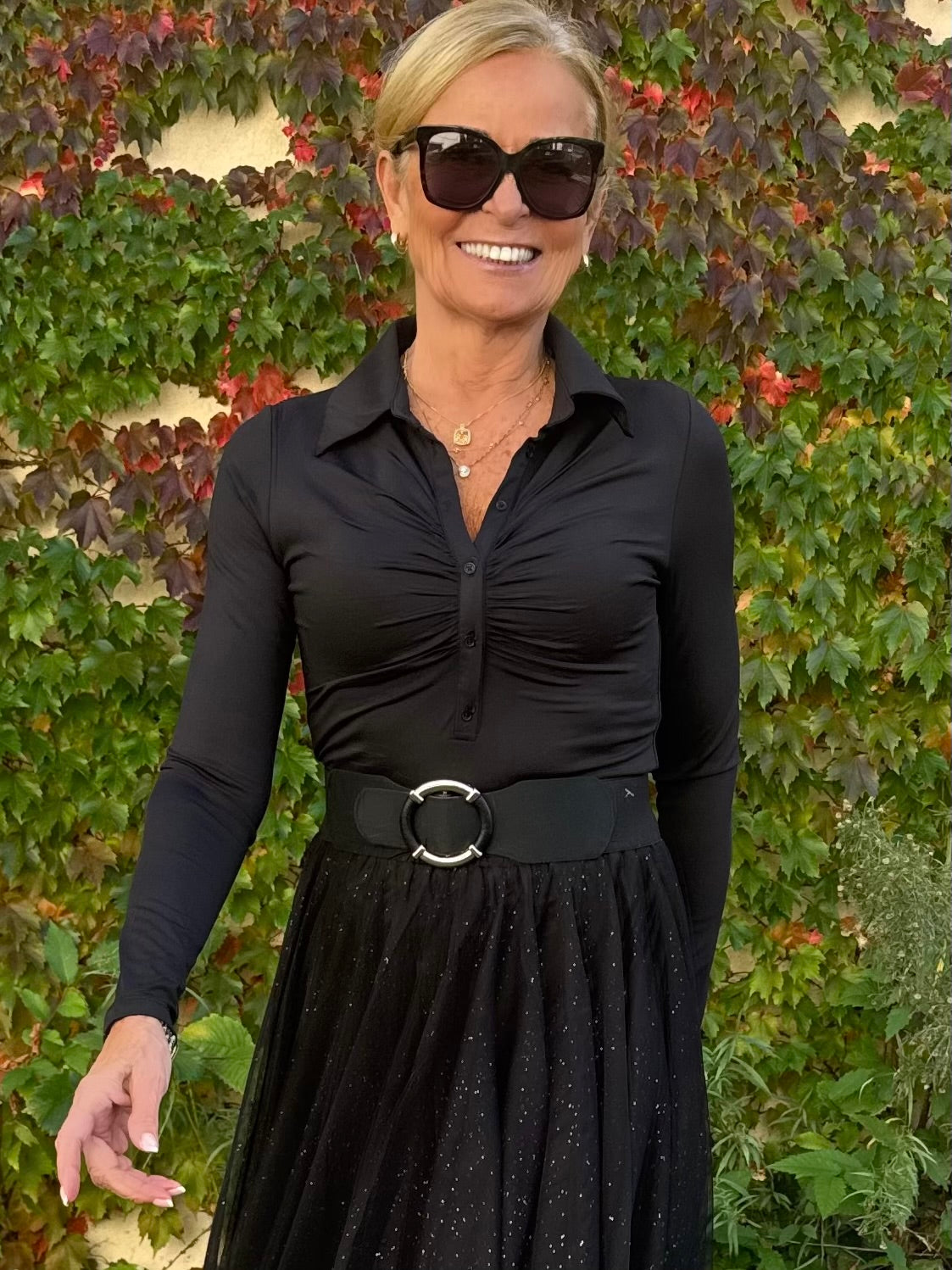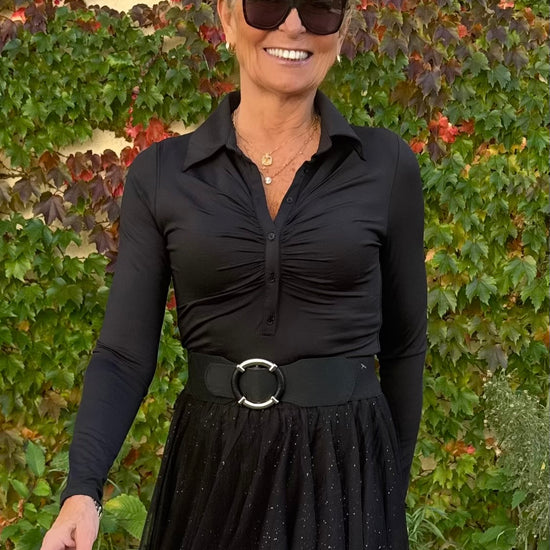 Elevate your everyday look with this slimming, full-length top. Featuring elegant ruching along the sides, a classic collar, and a 3/4 button-up front, it creates a figure-flattering silhouette while offering comfort and style. Perfect for layering or wearing on its own, this long-sleeve top pairs effortlessly with pants or skirts for a polished, confident look.