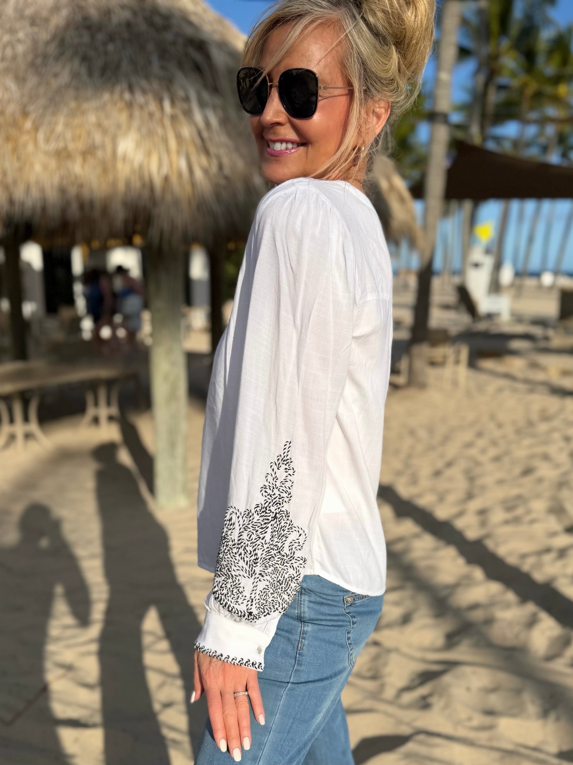 Elevate your wardrobe with this statement blouse featuring beautifully embroidered sleeves, a flattering V-neck with a mandarin collar, and three elegant button details. Long sleeves add sophistication, making it perfect for both workdays and special occasions. Preorder
