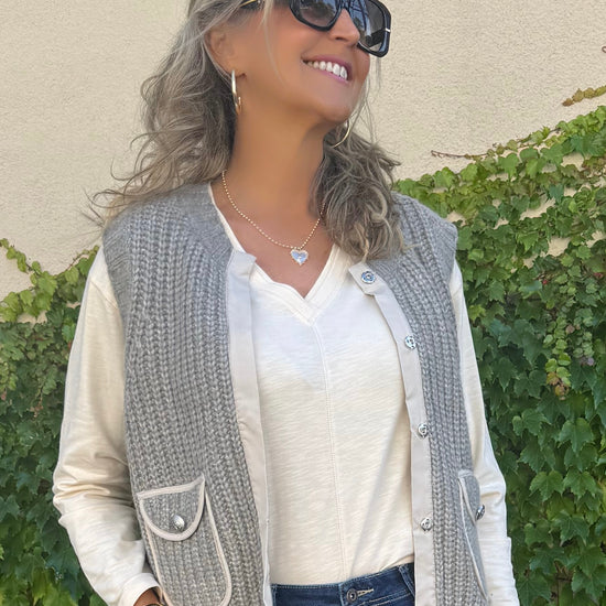 Elevate your layering game with this gorgeous sweater knit vest, designed to be worn open or closed thanks to its stylish snap closure. The soft knit fabric offers cozy comfort with a chic twist, while the striking contrast down the center adds a bold, eye-catching detail. Featuring kangaroo pockets with charming button accents, this vest blends function and fashion effortlessly. Perfect over a long-sleeve tee or under a jacket, it’s your go-to piece for transitional weather and year-round style.