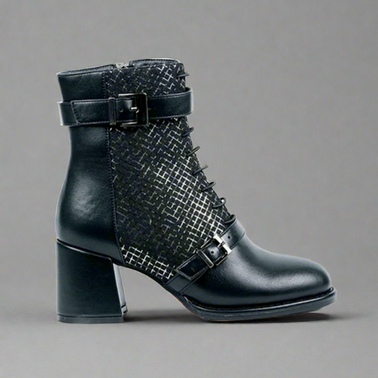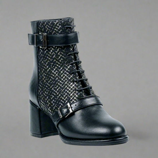 Suede and faux leather block heel bootie featuring chic buckle and lace-up details. Elevated and stylish with a side zipper for easy wear. Water-resistant and designed with latex foam cushioning for ultimate comfort.