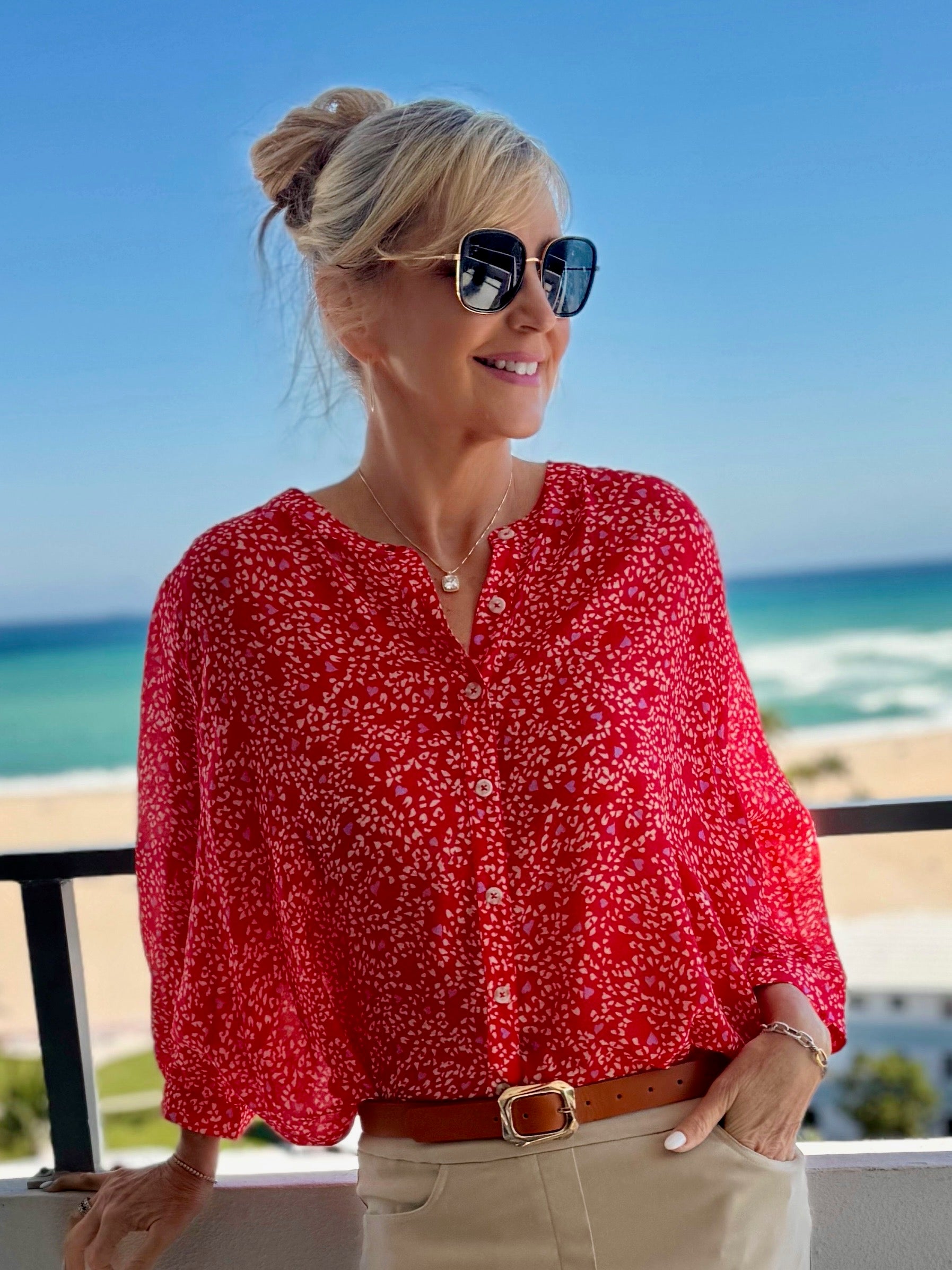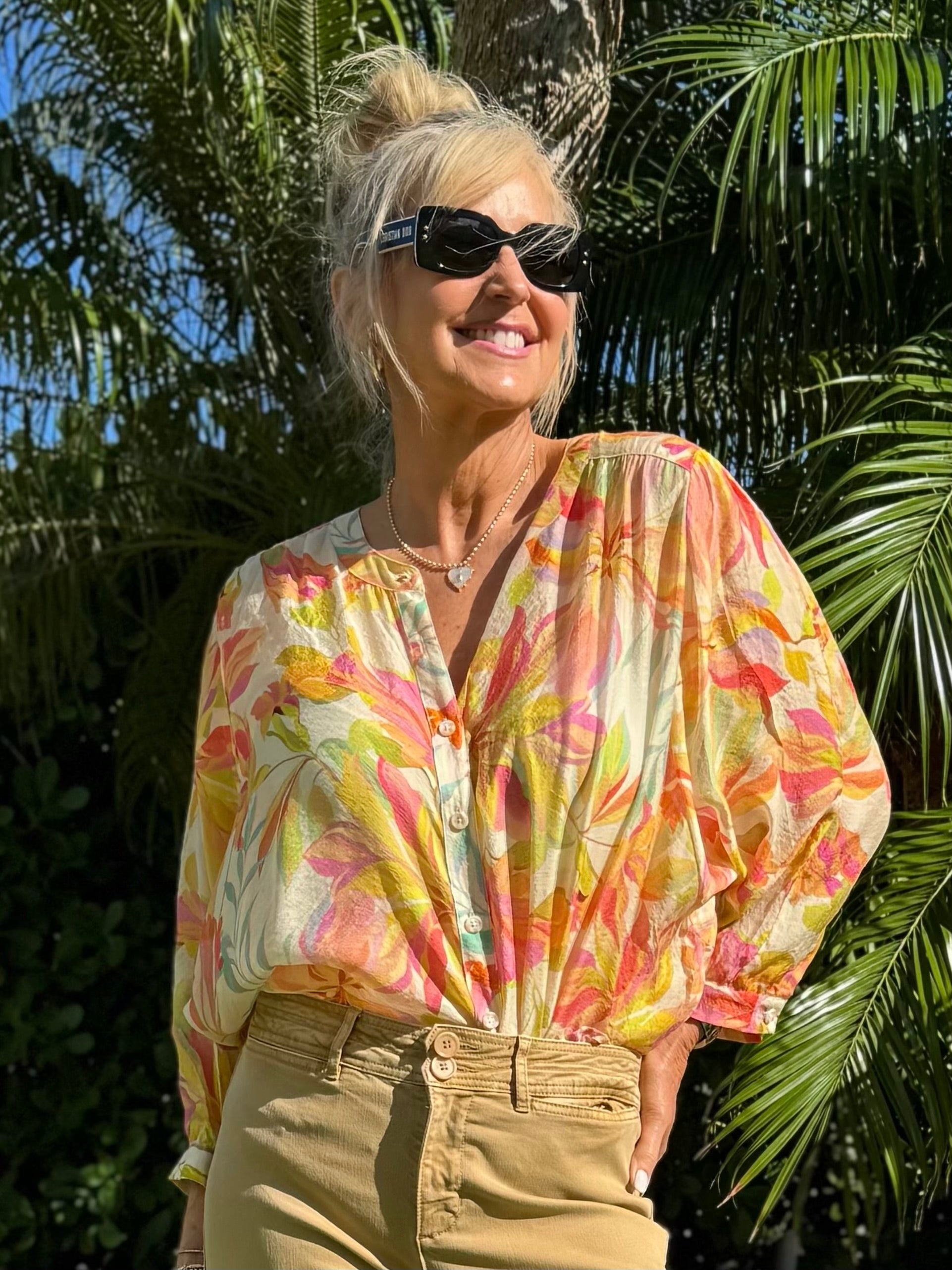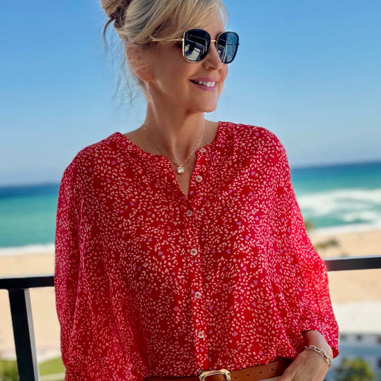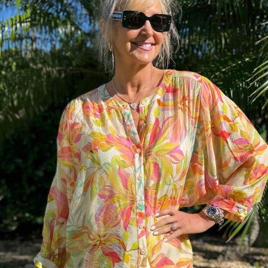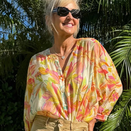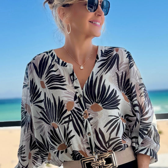 Float effortlessly through your day in our lightweight dolman sleeve blouse, crafted from luxuriously woven fabric in elegant prints. The notch neckline adds a touch of stylish breathability, while carefully designed button details enhance the look. Available in vibrant summer colours and timeless neutrals, this easy-to-wear blouse pairs beautifully with anything. Making it a versatile, go-to piece for warm days and beyond.