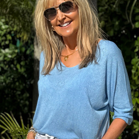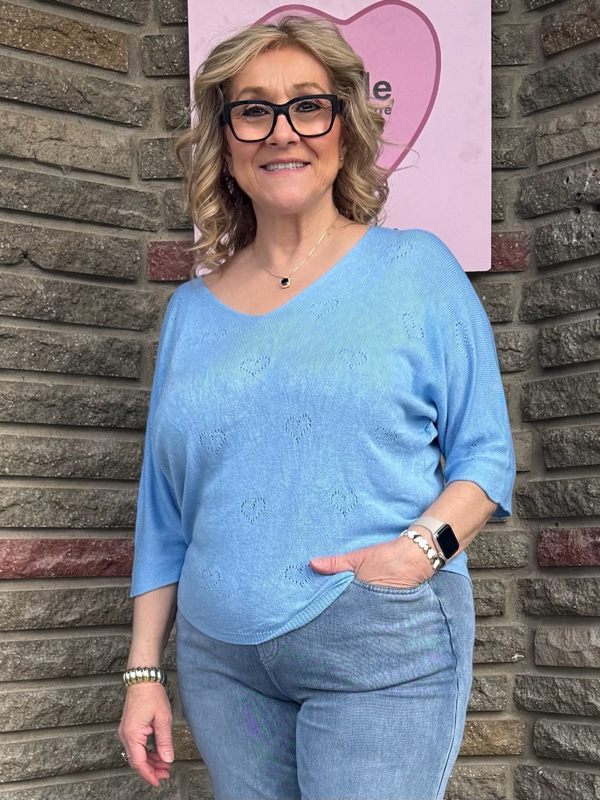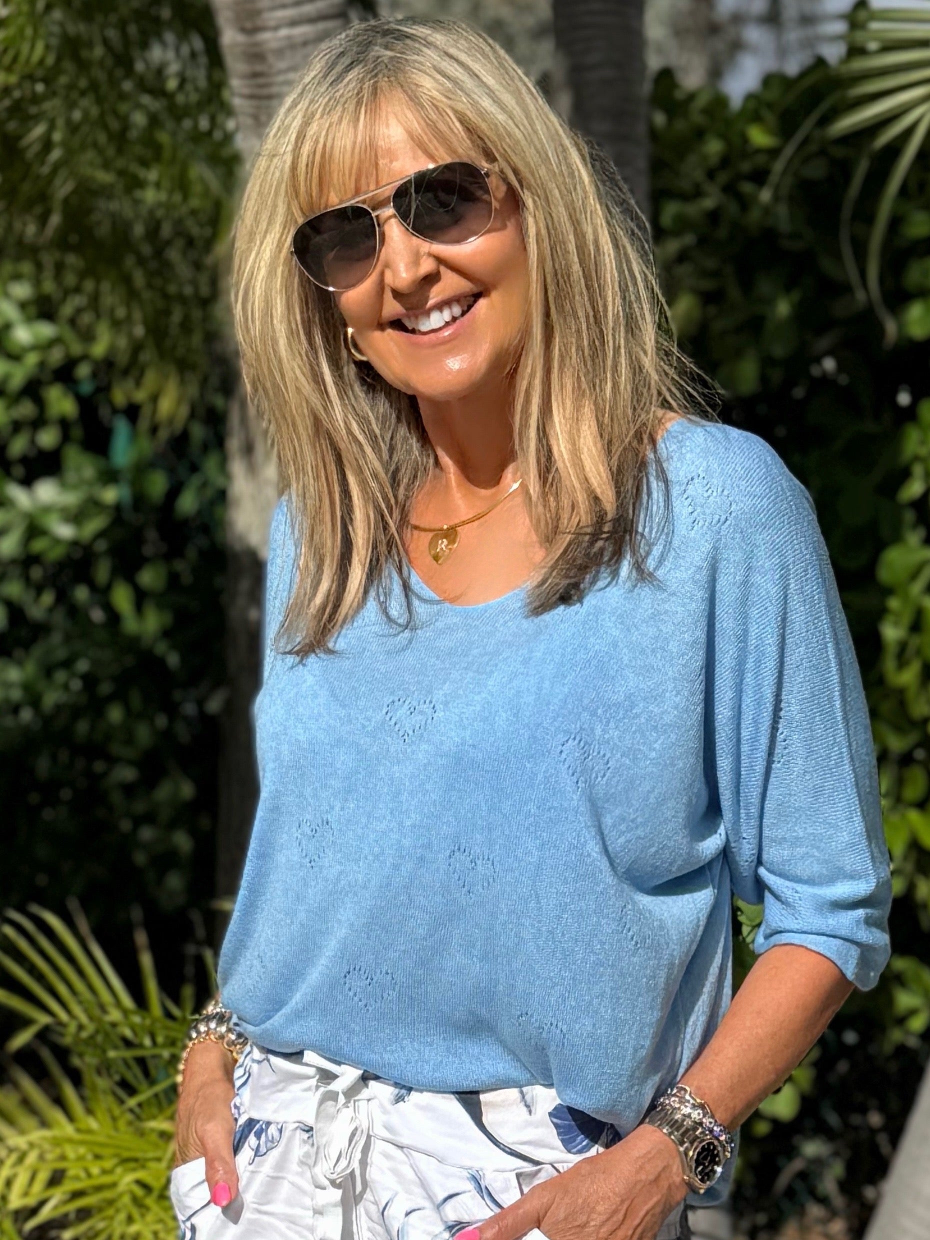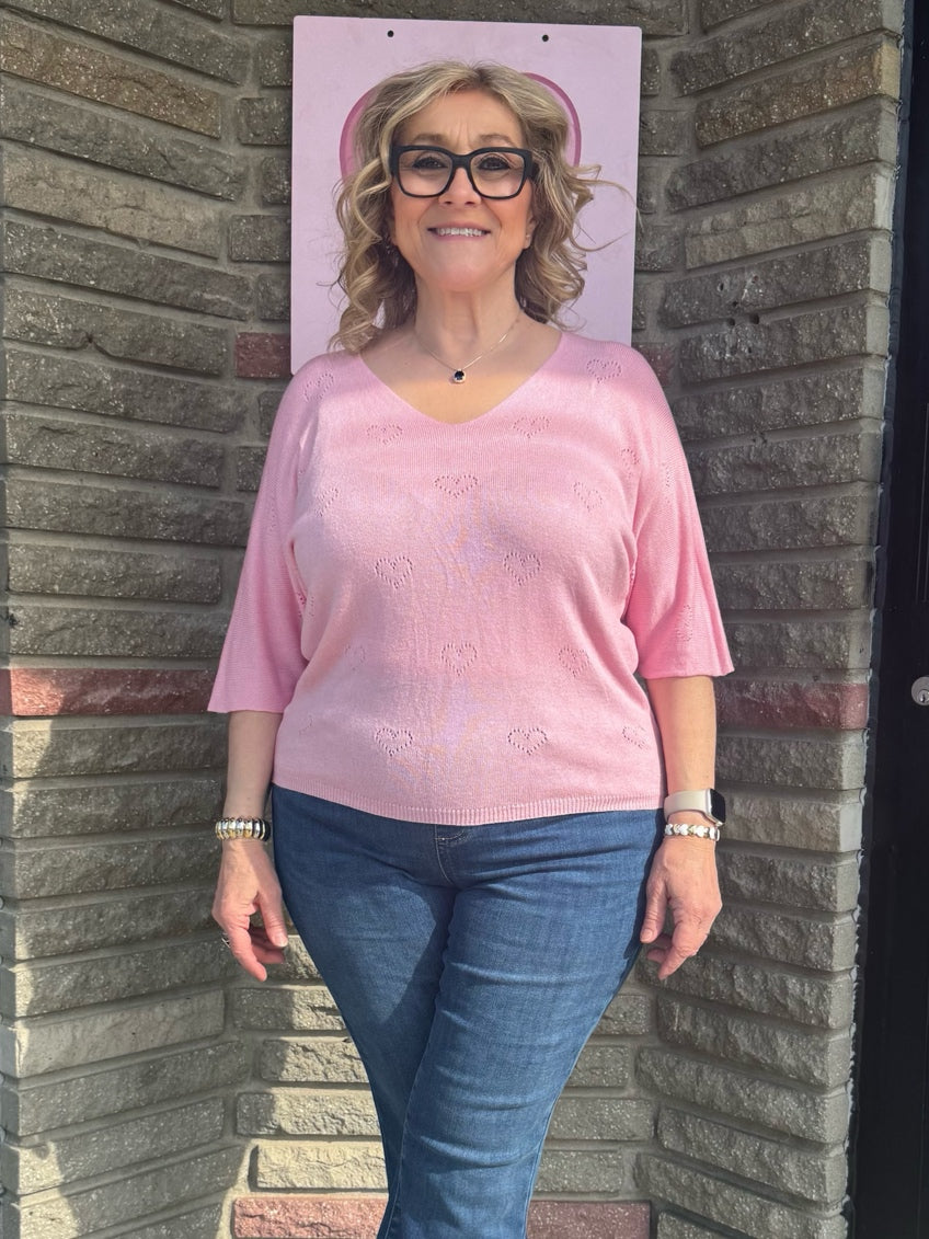 The sweetest knit you’ll reach for again and again! This lightweight V-neck sweater features delicate heart detailing throughout for a subtle, feminine touch. The soft knit fabric drapes beautifully without clinging, making it easy to wear on its own or layered.