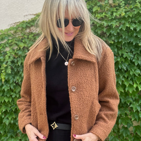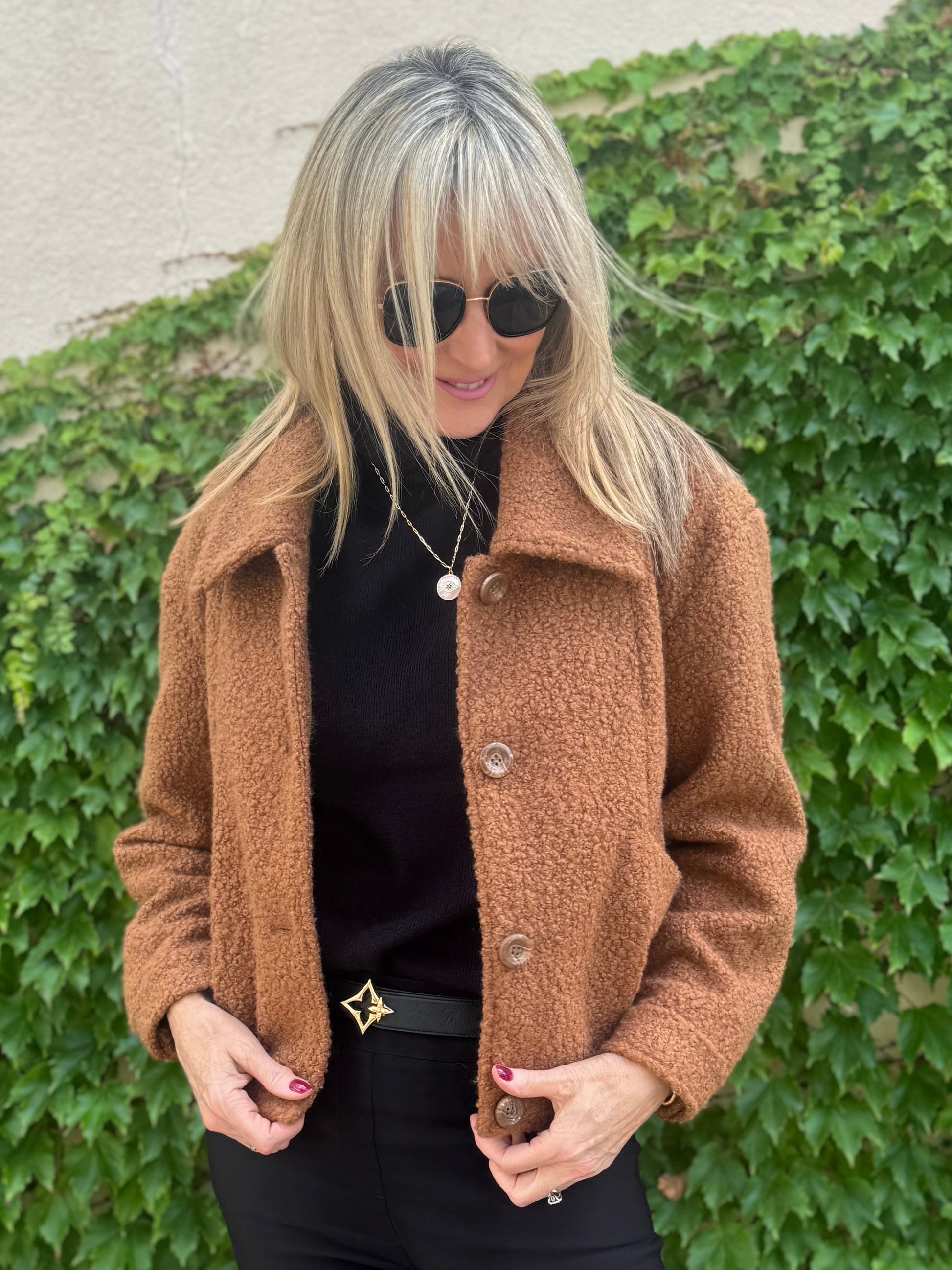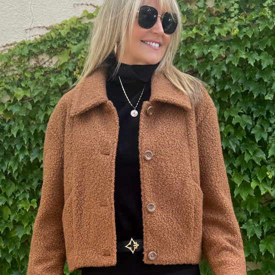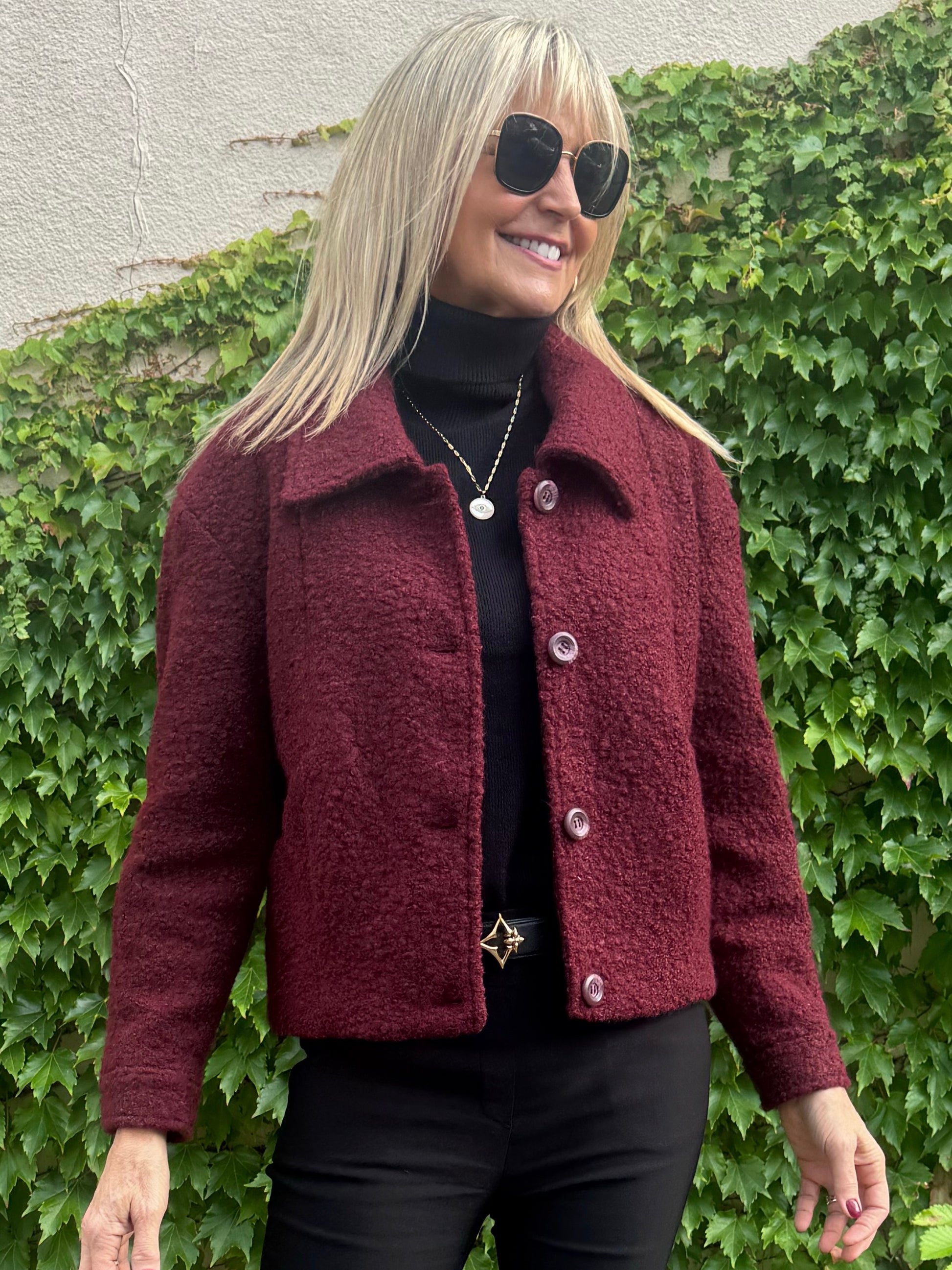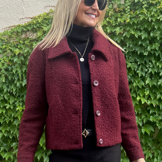 Stay on-trend with this stylish bouclé jacket, featuring a classic collared neckline and versatile button-up design. Wear it as a jacket for casual outings or as a blazer for a more polished look. Complete with functional pockets, it blends fashion and practicality for effortless everyday style. SIZE DOWN