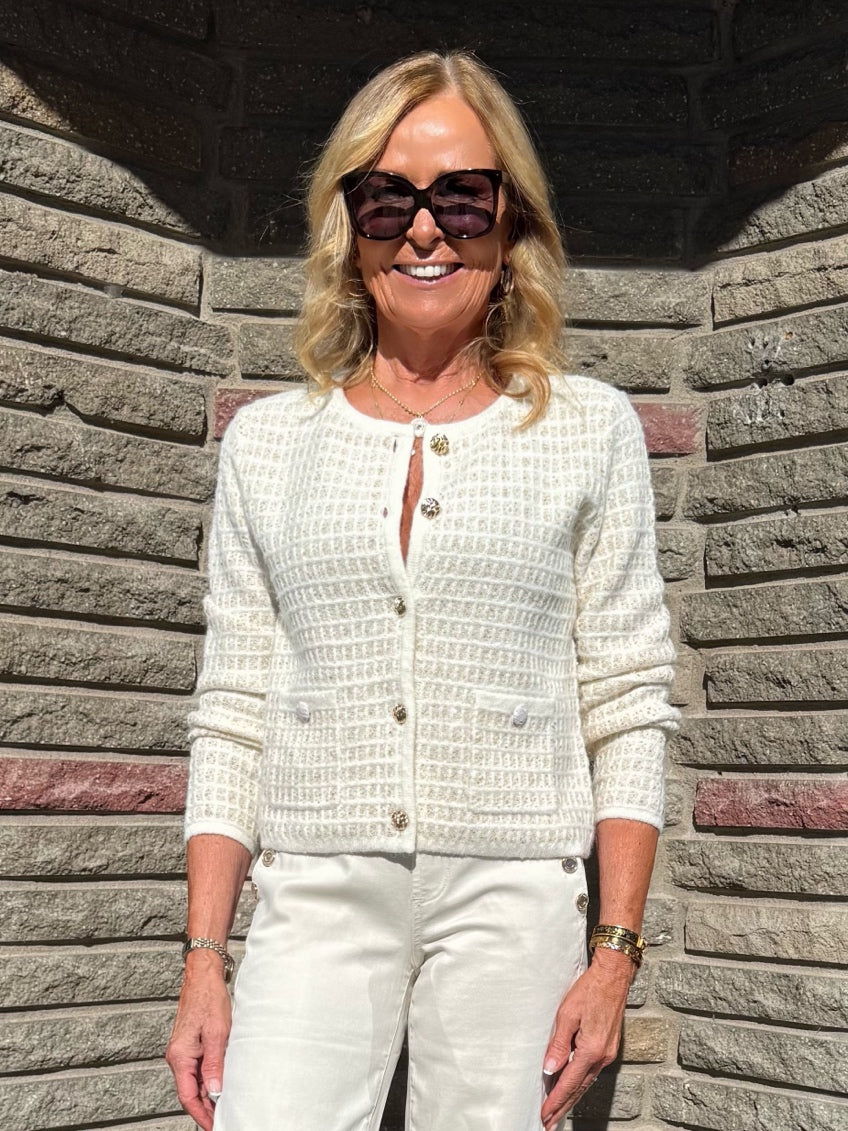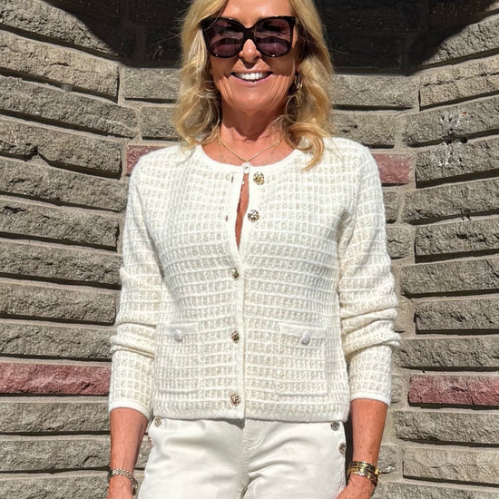 Sequined yarn and gleaming golden buttons give this sweater knit cover-up a dazzling allure. Framed by a classic crew neck and long straight sleeves, it features stylish front pockets adorned with golden buttons, making it a stunning addition to any wardrobe.