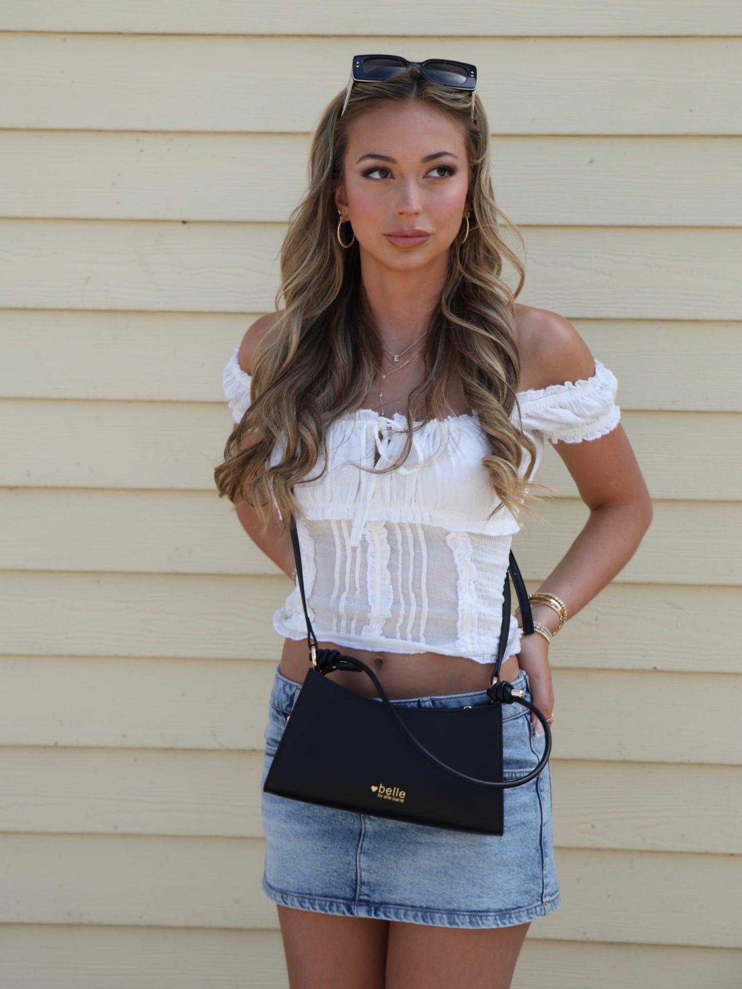 Inside, a sweet surprise awaits: a stamped message that reads "you look belle" — just a little reminder that you're beautiful. Thoughtful details like a soft knot accent, a removable long strap for versatile styling, and polished gold hardware give this bag its signature charm.