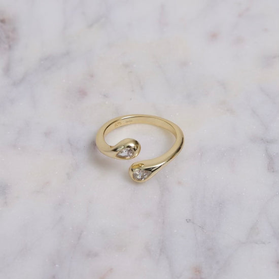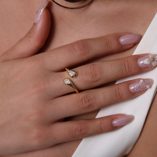 Crafted in luxe 14K gold vermeil over a 925 sterling silver base, the Twin Flame Ring features two brilliant pear-cut CZ stones that mirror each other in perfect harmony. Symbolizing the deep connection between kindred spirits, this wrap-style design is both meaningful and effortlessly modern. Whether it’s for yourself or your other half, this piece is made to shine with you.