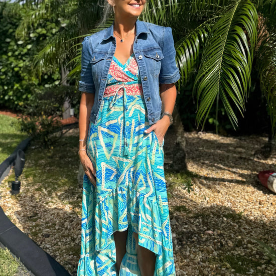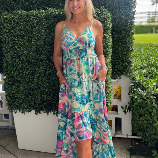 Stunning, flattering, and incredibly comfortable! This dress is guaranteed to wow! From our beloved Maui Collection, it’s lightweight with breathtaking prints and an effortlessly easy-to-wear silhouette. Featuring adjustable straps, a fully elasticized smocked back, and a slimming under-bust band that beautifully enhances your shape. Finished with a gorgeous hi-low hem and feminine ruffle detailing, this dress moves with you and feels just as good as it looks. PREORDER FOR MID JAN (SOLD OUT IN WATER MIX)