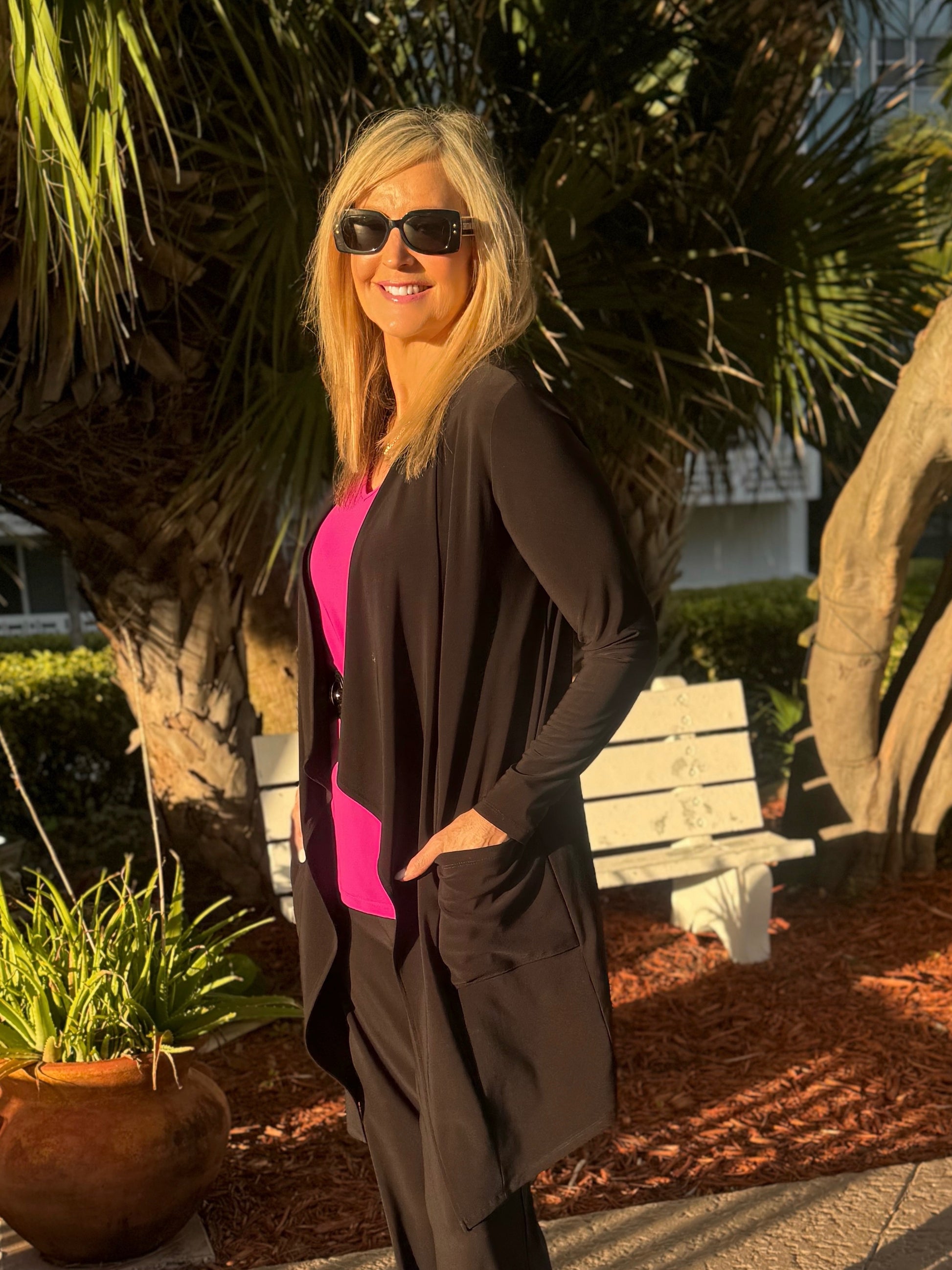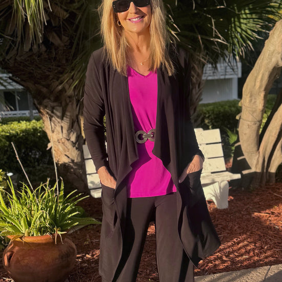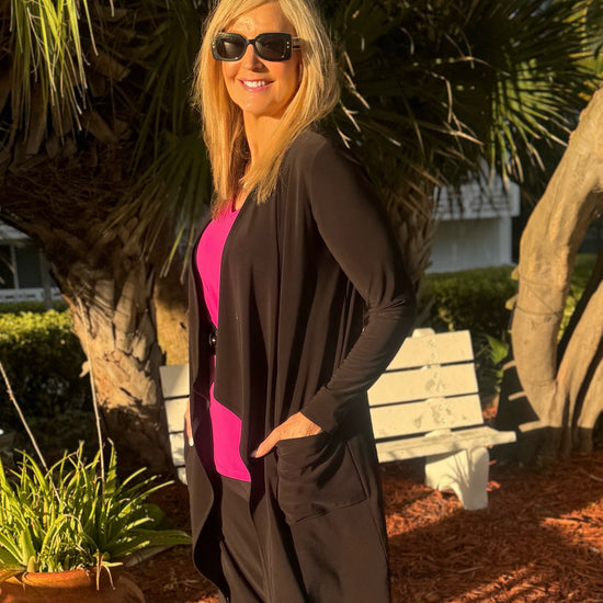This 4-season open-front cascading cardigan is an absolute must-have! Made in Canada from easy-to-wear ITY fabric, this versatile topper pairs effortlessly with just about anything in your wardrobe. Featuring front pockets and a longer length that’s perfect with leggings, it takes you seamlessly from day to night. The flattering drape provides comfortable coverage through the midsection and hips, making it a go-to piece you’ll reach for again and again. 💕