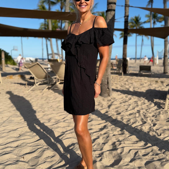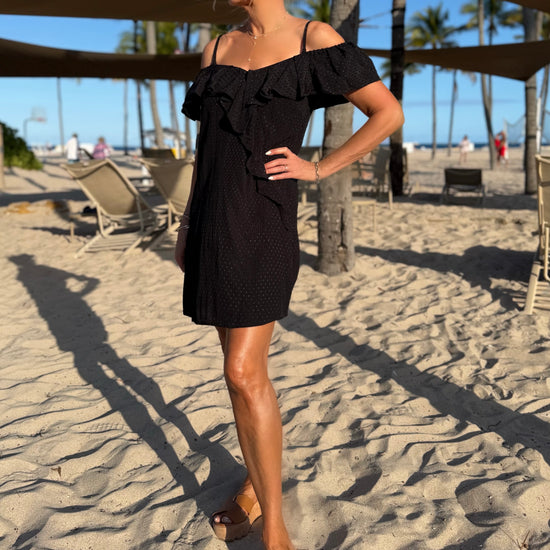 One dress, two effortless looks. This versatile piece can be worn on or off the shoulder, letting you switch from relaxed daytime chic to elevated evening elegance with ease. Designed with delicate ruffle detailing and a softly draped silhouette, it flatters while offering comfortable movement. The lightweight fabric makes it perfect for warm-weather days, vacations, or sunset dinners. Dress it up with wedges or keep it casual with sandals. This timeless style does it all. Preorder
